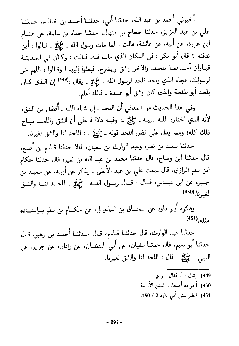 أَخْبَرَنِي أَحْمَدُ بْنُ عَبْدِ اللَّهِ حَدَّثَنَا أَبِي حَدَّثَنَا أَحْمَدُ بْنُ خَالِدٍ حَدَّثَنَا عَلِيُّ بْنُ عَبْدِ الْعَزِيزِ حَدَّثَنَا حَجَّاجُ بْنُ مِنْهَالٍ حَدَّثَنَا حَمَّادُ بْنُ سَلَمَةَ عَنْ هشام ابن عُرْوَةَ عَنْ أَبِيهِ عَنْ عَائِشَةَ قَالَتْ لَمَّا مَاتَ رَسُولِ اللَّهِ صَلَّى اللَّهُ عَلَيْهِ وَسَلَّمَ قَالُوا أَيْنَ نَدْفِنُهُ قَالَ أَبُو بَكْرٍ فِي الْمَكَانِ الَّذِي مَاتَ فِيهِ قَالَتْ وَكَانَ فِي الْمَدِينَةِ قَبَّارَانِ أَحَدُهُمَا يَلْحَدُ وَالْآخَرُ يَشُقُّ وَيَضْرُحُ فَبَعَثُوا إِلَيْهِمَا وَقَالُوا اللَّهُمَّ خِرْ لِرَسُولِكَ فَجَاءَ الَّذِي يُلْحِدُ فَلَحَدَ لِرَسُولِ اللَّهِ صَلَّى اللَّهُ عَلَيْهِ وَسَلَّمَ يُقَالُ إِنَّ الَّذِي يُلْحِدُ أَبُو طَلْحَةَ وَالَّذِي كَانَ يَشُقُّ أَبُو عُبَيْدَةَ فَاللَّهُ أَعْلَمُ وَفِي هَذَا الْحَدِيثِ مِنَ الْمَعَانِي أَنَّ اللَّحْدَ إِنْ شَاءَ اللَّهُ أَفْضَلُ مِنَ الشَّقِّ لِأَنَّهُ الَّذِي اخْتَارَهُ اللَّهُ لِنَبِيِّهِ صَلَّى اللَّهُ عَلَيْهِ وَسَلَّمَ وَفِيهِ عَلَى أَنَّ الشَّقَّ وَاللَّحْدَ مُبَاحٌ ذَلِكَ كُلُّهُ وَمِمَّا يَدُلُّ عَلَى فَضْلِ اللَّحْدِ قَوْلُهُ صَلَّى اللَّهُ عَلَيْهِ وَسَلَّمَ اللَّحْدُ لَنَا وَالشَّقُّ لِغَيْرِنَا حَدَّثَنَا سَعِيدُ بْنُ نَصْرٍ وَعَبْدُ الْوَارِثِ بْنُ سُفْيَانَ قَالَا حَدَّثَنَا قَاسِمُ بْنُ أَصْبَغَ قَالَ حَدَّثَنَا ابْنُ وَضَّاحٍ قَالَ حَدَّثَنَا مُحَمَّدُ بْنُ عَبْدِ اللَّهِ بْنِ نُمَيْرٍ قال حدثنا حكام ابن سَلْمٍ الرَّازِّيُّ قَالَ سَمِعْتُ عَلِيَّ بْنَ عَبْدِ الْأَعْلَى يَذْكُرُ عَنْ أَبِيهِ عَنْ سَعِيدِ بْنِ جُبَيْرٍ عَنِ ابْنِ عَبَّاسٍ قَالَ قَالَ رَسُولُ اللَّهِ صَلَّى اللَّهُ عَلَيْهِ وَسَلَّمَ اللَّحْدُ لَنَا وَالشَّقُّ لِغَيْرِنَا وَذَكَرَهُ أَبُو دَاوُدَ عَنْ إِسْحَاقَ بْنِ إِسْمَاعِيلَ عَنْ حَكَّامِ بْنِ سَلْمٍ بِإِسْنَادِهِ مِثْلَهُ حَدَّثَنَا عَبْدُ الْوَارِثِ قَالَ حَدَّثَنَا قَاسِمٌ قَالَ حَدَّثَنَا أَحْمَدُ بْنُ زُهَيْرٍ قَالَ حَدَّثَنَا أَبُو نُعَيْمٍ قَالَ حَدَّثَنَا سُفْيَانُ عَنْ أَبِي الْيَقْظَانِ عَنْ زَاذَانَ عَنْ جَرِيرٍ عَنِ النَّبِيِّ صَلَّى اللَّهُ عَلَيْهِ وَسَلَّمَ قل اللَّحْدُ لَنَا وَالشَّقُّ لِغَيْرِنَا
