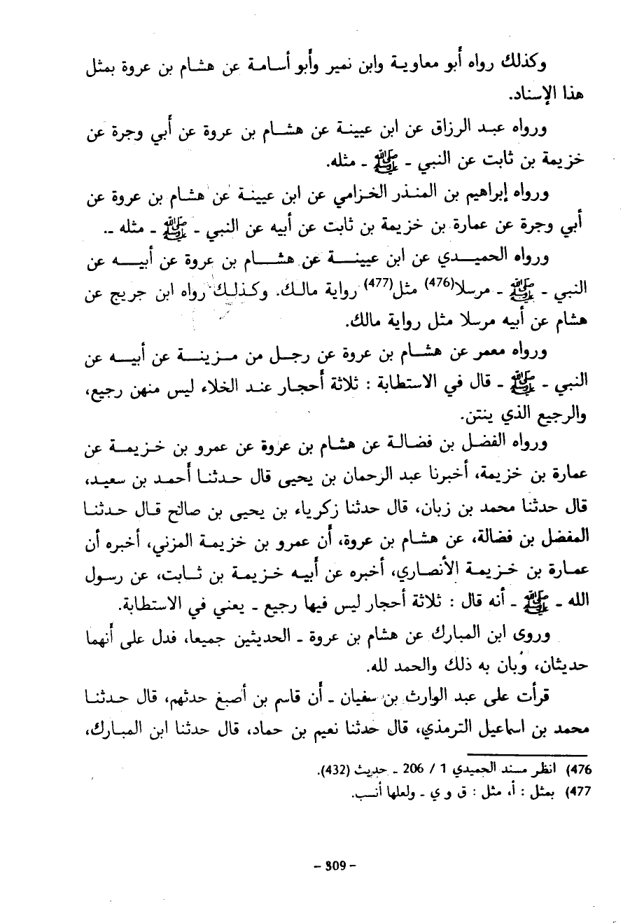 وكذلك رواه أبو معاوية وابن نمير وابو أُسَامَةَ عَنْ هِشَامِ بْنِ عُرْوَةَ بِمِثْلِ هَذَا الْإِسْنَادِ وَرَوَاهُ عَبْدُ الرَّزَّاقِ عَنِ ابْنِ عُيَيْنَةَ عَنْ هِشَامِ بن عروة عن أبي وجرة عَنْ خُزَيْمَةَ بْنِ ثَابِتٌ عَنِ النَّبِيِّ صَلَّى اللَّهُ عَلَيْهِ وَسَلَّمَ مِثْلَهُ وَرَوَاهُ إِبْرَاهِيمُ بْنُ الْمُنْذِرِ الْخُزَامِيُّ عَنِ ابْنِ عُيَيْنَةَ عَنْ هِشَامِ بْنِ عُرْوَةَ عن أبي وجرة عَنْ عُمَارَةَ بْنِ خُزَيْمَةَ بْنِ ثَابِتٍ عَنْ أَبِيهِ عَنِ النَّبِيِّ صَلَّى اللَّهُ عَلَيْهِ وَسَلَّمَ مثله ورواه الحميدي عَنِ ابْنِ عُيَيْنَةَ عَنْ هِشَامِ بْنِ عُرْوَةَ عَنْ أَبِيهِ عَنْ النَّبِيِّ صَلَّى اللَّهُ عَلَيْهِ وَسَلَّمَ مُرْسَلًا مِثْلَ رِوَايَةِ مَالِكٍ وَكَذَلِكَ رَوَاهُ ابْنُ جُرَيْجٍ عَنْ هِشَامٍ عَنْ أَبِيهِ مُرْسَلًا مِثْلَ رِوَايَةِ مَالِكٍ وَرَوَاهُ مَعْمَرٌ عَنْ هِشَامِ بْنِ عُرْوَةَ عَنْ رَجُلٍ مِنْ مُزَيْنَةَ عَنْ أَبِيهِ عَنِ النَّبِيِّ صَلَّى اللَّهُ عَلَيْهِ وَسَلَّمَ قَالَ فِي الِاسْتِطَابَةِ ثَلَاثَةُ أَحْجَارٍ عِنْدَ الْخَلَاءِ لَيْسَ مِنْهُنَّ رَجِيعٌ وَالرَّجِيعُ الَّذِي يَنْتُنُ وَرَوَاهُ الْفَضْلُ بْنُ فَضَالَةَ عَنْ هِشَامِ بْنِ عُرْوَةَ عَنْ عَمْرِو بْنِ خُزَيْمَةَ عَنْ عُمَارَةَ بْنِ خزيمة أخبرنا عبد الرحمان بْنُ يَحْيَى قَالَ حَدَّثَنَا أَحْمَدُ بْنُ سَعِيدٍ قَالَ حَدَّثَنَا مُحَمَّدُ بْنُ زَبَّانَ قَالَ حَدَّثَنَا زَكَرِيَّاءُ بْنُ يَحْيَى بْنِ صَالِحٍ قَالَ حَدَّثَنَا الْمُفَضَّلُ بْنُ فَضَالَةَ عَنْ هِشَامِ بْنِ عُرْوَةَ أَنَّ عَمْرَو بْنَ خُزَيْمَةَ الْمُزَنِيَّ أَخْبَرَهُ أَنَّ عُمَارَةَ بْنَ خُزَيْمَةَ الْأَنْصَارِيَّ أَخْبَرَهُ عَنْ أَبِيهِ خُزَيْمَةَ بْنِ ثَابِتٍ عَنْ رَسُولِ اللَّهِ صَلَّى اللَّهُ عَلَيْهِ وَسَلَّمَ أَنَّهُ قَالَ ثَلَاثَةُ أَحْجَارٍ لَيْسَ فِيهَا رَجِيعٌ يَعْنِي فِي الِاسْتِطَابَةِ وَرَوَى ابْنُ الْمُبَارَكِ عَنْ هِشَامِ بْنِ عُرْوَةَ الْحَدِيثَيْنِ جَمِيعًا فَدَلَّ عَلَى أَنَّهُمَا حَدِيثَانِ وَبَانَ بِهِ ذَلِكَ وَالْحَمْدُ لِلَّهِ قَرَأْتُ عَلَى عَبْدِ الْوَارِثِ بْنِ سُفْيَانَ أَنَّ قَاسِمَ بْنَ أَصْبَغَ حَدَّثَهُمْ قَالَ حَدَّثَنَا مُحَمَّدُ بْنُ إِسْمَاعِيلَ التِّرْمِذِيُّ قَالَ حَدَّثَنَا نُعَيْمُ بْنُ حَمَّادٍ قَالَ حَدَّثَنَا ابْنُ الْمُبَارَكِ