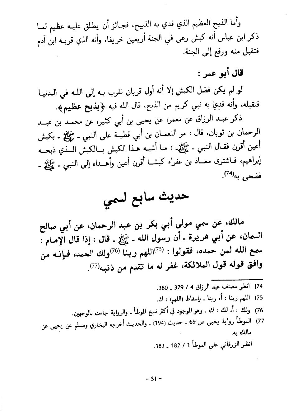وَأَمَّا الذِّبْحُ الْعَظِيمُ الَّذِي فُدِيَ بِهِ الذَّبِيحُ فَجَائِزٌ أَنْ يُطْلَقَ عَلَيْهِ عَظِيمٌ لِمَا ذَكَرَ ابْنُ عَبَّاسٍ أَنَّهُ كَبْشٌ رَعَى فِي الْجَنَّةِ أَرْبَعِينَ خَرِيفًا وَأَنَّهُ الَّذِي قَرَّبَهُ ابْنُ آدَمَ فَتُقُبِّلَ مِنْهُ وَرُفِعَ إِلَى الْجَنَّةِ قَالَ أَبُو عُمَرَ لَوْ لَمْ يَكُنْ فَضْلُ الْكَبْشِ إِلَّا أَنَّهُ أَوَّلُ قُرْبَانٍ تُقُرِّبَ بِهِ إِلَى اللَّهِ فِي الدُّنْيَا فَتَقَبَّلَهُ وَأَنَّهُ فُدِيَ بِهِ نَبِيٌّ كَرِيمٌ مِنَ الذَّبْحِ قَالَ اللَّهُ فِيهِ بِذِبْحٍ عَظِيمٍ ذَكَرَ عَبْدُ الرَّزَّاقِ عَنْ مَعْمَرٌ عَنْ يَحْيَى بْنِ أَبِي كَثِيرٍ عَنْ مُحَمَّدِ بْنِ عبد الرحمان بْنِ ثَوْبَانَ قَالَ مَرَّ النُّعْمَانُ بْنُ أَبِي قُطْبَةَ عَلَى النَّبِيِّ صَلَّى اللَّهُ عَلَيْهِ وَسَلَّمَ بِكَبْشٍ أَعْيَنَ أَقْرَنَ فَقَالَ النَّبِيُّ صَلَّى اللَّهُ عَلَيْهِ وَسَلَّمَ مَا أَشْبَهَ هَذَا الْكَبْشَ بِالْكَبْشِ الَّذِي ذَبَحَهُ إِبْرَاهِيمُ فَاشْتَرَى مُعَاذُ بْنُ عَفْرَاءَ كَبْشًا أَقْرَنَ أَعْيَنَ وَأَهْدَاهُ إِلَى النَّبِيِّ صَلَّى اللَّهُ عَلَيْهِ وَسَلَّمَ فَضَحَّى بِهِ