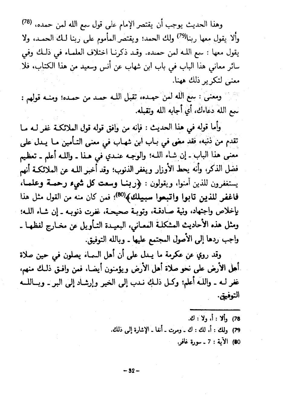 وَهَذَا الْحَدِيثُ يُوجِبُ أَنْ يَقْتَصِرَ الْإِمَامُ عَلَى قَوْلِ سَمِعَ اللَّهُ لِمَنْ حَمِدَهُ وَأَلَّا يَقُولَ مَعَهَا رَبَّنَا وَلَكَ الْحَمْدُ وَيَقْتَصِرُ الْمَأْمُومُ عَلَى رَبَّنَا لَكَ الْحَمْدُ وَلَا يَقُولُ مَعَهَا سَمِعَ اللَّهُ لِمَنْ حَمِدَهُ وَقَدْ ذَكَرْنَا اخْتِلَافَ الْعُلَمَاءِ فِي ذَلِكَ وَفِي سَائِرِ مَعَانِي هَذَا الْبَابِ فِي بَابِ ابْنِ شِهَابٍ عَنْ أَنَسٍ وَسَعِيدٍ مِنْ هَذَا الْكِتَابِ فَلَا مَعْنَى لِتَكْرِيرِ ذَلِكَ ههنا وَمَعْنَى سَمِعَ اللَّهُ لِمَنْ حَمِدَهُ تَقَبَّلَ اللَّهُ حَمْدَ مَنْ حَمِدَهُ وَمِنْهُ قَوْلُهُمْ سَمِعَ اللَّهُ دُعَاءَكَ أَيْ أَجَابَهُ اللَّهُ وَتَقَبَّلَهُ وَأَمَّا قَوْلُهُ فِي هَذَا الْحَدِيثِ فَإِنَّهُ مَنْ وَافَقَ قَوْلُهُ قول الملائكة غفر مَا تَقَدَّمَ مِنْ ذَنْبِهِ فَقَدْ مَضَى فِي بَابِ ابْنِ شِهَابٍ فِي مَعْنَى التَّأْمِينِ مَا يَدُلُّ عَلَى مَعْنَى هَذَا الْبَابِ إِنْ شَاءَ اللَّهُ وَالْوَجْهُ عِنْدِي فِي هَذَا وَاللَّهُ أَعْلَمُ تَعْظِيمُ فَضْلِ الذِّكْرِ وَأَنَّهُ يَحُطُّ الْأَوْزَارَ وَيَغْفِرُ الذُّنُوبَ وَقَدْ أَخْبَرَ اللَّهُ عَنِ الْمَلَائِكَةِ أَنَّهُمْ يَسْتَغْفِرُونَ لِلَّذِينِ آمَنُوا وَيَقُولُونَ رَبَّنَا وَسِعْتَ كُلَّ شَيْءٍ رَحْمَةً وَعِلْمًا فَاغْفِرْ لِلَّذِينَ تَابُوا وَاتَّبَعُوا سَبِيلَكَ فَمَنْ كَانَ مِنْهُ مِنَ الْقَوْلِ مِثْلُ هَذَا بِإِخْلَاصٍ وَاجْتِهَادٍ وَنِيَّةٍ صَادِقَةٍ وَتَوْبَةٍ صَحِيحَةٍ غُفِرَتْ ذُنُوبُهُ إِنْ شَاءَ اللَّهُ وَمِثْلُ هَذِهِ الْأَحَادِيثِ الْمُشْكَلَةِ الْمَعَانِي الْبَعِيدَةِ التَّأْوِيلِ عَنْ مَخَارِجِ لَفْظِهَا وَاجِبٌ رَدُّهَا إِلَى الْأُصُولِ الْمُجْتَمَعِ عَلَيْهَا وَبِاللَّهِ التَّوْفِيقُ وَقَدْ رُوِيَ عَنْ عِكْرِمَةَ مَا يَدُلُّ عَلَى أَنَّ أَهْلَ السَّمَاءِ يُصَلُّونَ فِي حِينِ صَلَاةِ أَهْلِ الْأَرْضِ عَلَى نَحْوِ صَلَاةِ أَهْلِ الْأَرْضِ وَيُؤَمِّنُونَ أَيْضًا فَمَنْ وَافَقَ ذَلِكَ مِنْهُمْ غُفِرَ لَهُ وَاللَّهُ أَعْلَمُ وَكُلُّ ذَلِكَ نَدْبٌ إِلَى الْخَيْرِ وَإِرْشَادٌ إِلَى الْبِرِّ وَبِاللَّهِ التوفيق