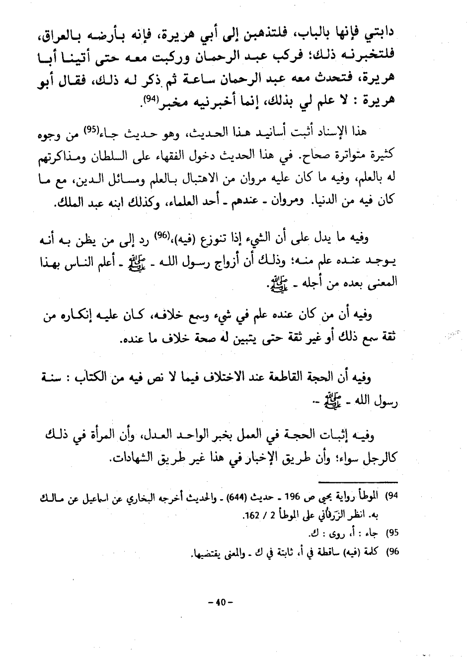 دَابَّتِي فَإِنَّهَا بِالْبَابِ فَلَتَذْهَبَنَّ إِلَى أَبِي هُرَيْرَةَ فَإِنَّهُ بِأَرْضِهِ بِالْعِرَاقِ فَلْتُخْبِرَنَّهُ ذَلِكَ فَرَكِبَ عَبْدُ الرحمان وَرَكِبْتُ مَعَهُ حَتَّى أَتَيْنَا أَبَا هُرَيْرَةَ فَتَحَدَّثَ معه عبد الرحمان سَاعَةً ثُمَّ ذَكَرَ لَهُ ذَلِكَ فَقَالَ أَبُو هُرَيْرَةَ لَا عِلْمَ لِي بِذَلِكَ إِنَّمَا أَخْبَرَنِيهِ مُخْبِرٌ هَذَا الْإِسْنَادُ أَثْبَتُ أَسَانِيدِ هَذَا الْحَدِيثِ وَهُوَ حَدِيثٌ جَاءَ مِنْ وُجُوهٍ كَثِيرَةٍ مُتَوَاتِرَةٍ صِحَاحٍ فِي هَذَا الْحَدِيثِ دُخُولُ الْفُقَهَاءِ عَلَى السُّلْطَانِ وَمُذَاكَرَتُهُمْ لَهُ بِالْعِلْمِ وَفِيهِ مَا كَانَ عَلَيْهِ مَرْوَانُ مِنَ الِاهْتِبَالِ بِالْعِلْمِ وَمَسَائِلِ الدِّينِ مَعَ مَا كَانَ فِيهِ مِنَ الدُّنْيَا وَمَرْوَانُ عِنْدَهُمْ أَحَدُ الْعُلَمَاءِ وَكَذَلِكَ ابْنُهُ عَبْدُ الْمَلِكِ وَفِيهِ مَا يَدُلُّ عَلَى أَنَّ الشَّيْءَ إِذَا تُنُوزِعَ (فِيهِ) رُدَّ إِلَى مَنْ يُظَنُّ بِهِ أَنَّهُ يُوجَدُ عِنْدَهُ عِلْمٌ مِنْهُ وَذَلِكَ أَنَّ أَزْوَاجَ رَسُولِ اللَّهِ صَلَّى اللَّهُ عَلَيْهِ وَسَلَّمَ أَعْلَمُ النَّاسِ بِهَذَا الْمَعْنَى بَعْدَهُ مِنْ أَجْلِهِ صَلَّى اللَّهُ عَلَيْهِ وَسَلَّمَ وَفِيهِ أَنَّ مَنْ كَانَ عِنْدَهُ عِلْمٌ فِي شَيْءٍ وَسَمِعَ خِلَافَهُ كَانَ عَلَيْهِ إِنْكَارُهُ مِنْ ثِقَةٍ سَمِعَ ذَلِكَ أو غير ثِقَةٌ حَتَّى يَتَبَيَّنَ لَهُ صِحَّةُ خِلَافِ مَا عِنْدَهُ وَفِيهِ أَنَّ الْحُجَّةَ الْقَاطِعَةَ عِنْدَ الِاخْتِلَافِ فِيمَا لَا نَصَّ فِيهِ مِنَ الْكِتَابِ سُنَّةُ رَسُولِ اللَّهِ صَلَّى اللَّهُ عَلَيْهِ وَسَلَّمَ وَفِيهِ إِثْبَاتُ الْحُجَّةِ فِي الْعَمَلِ بِخَبَرِ الْوَاحِدِ الْعَدْلِ وَأَنَّ الْمَرْأَةَ فِي ذَلِكَ كَالرَّجُلِ سَوَاءٌ وَأَنَّ طَرِيقَ الْإِخْبَارِ فِي هَذَا غَيْرُ طَرِيقِ الشَّهَادَاتِ