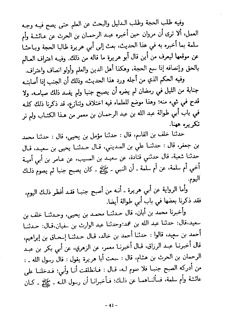 وَفِيهِ طَلَبُ الْحُجَّةِ وَطَلَبُ الدَّلِيلِ وَالْبَحْثُ عَنِ الْعِلْمِ حَتَّى يَصِحَّ فِيهِ وَجْهُ الْعَمَلِ أَلَا ترى ان مروان حين أخبره عبد الرحمان بن الحرث عَنْ عَائِشَةَ وَأُمِّ سَلَمَةَ بِمَا أَخْبَرَهُ بِهِ فِي هَذَا الْحَدِيثِ بَعَثَ إِلَى أَبِي هُرَيْرَةَ طَالِبًا الْحُجَّةَ وَبَاحِثًا عَنْ مَوْقِعِهَا لِيَعْرِفَ مِنْ أَيْنَ قَالَ أَبُو هُرَيْرَةَ مَا قَالَهُ مِنْ ذلك ز وَفِيهِ اعْتِرَافُ الْعَالِمِ بِالْحَقِّ وَإِنْصَافُهُ إِذَا سَمِعَ الحجة وهكذا أهل الدين والعلم وأولو إِنْصَافٍ وَاعْتِرَافٍ وَفِيهِ الْحُكْمُ الَّذِي مِنْ أَجْلِهِ وَرَدَ هَذَا الْحَدِيثُ وَذَلِكَ أَنَّ الْجُنُبَ إِذَا أصابته جنابة من الليل في رمضان لم يضره أَنْ يُصْبِحَ جُنُبًا وَلَمْ يُفْسِدْ ذَلِكَ صِيَامَهُ وَلَا قَدْحَ فِي شَيْءٍ مِنْهُ وَهَذَا مَوْضِعٌ لِلْعُلَمَاءِ فِيهِ اخْتِلَافٌ وَتَنَازُعٌ قَدْ ذَكَرْنَا ذَلِكَ كُلَّهُ فِي بَابِ أَبِي طُوَالَةَ عَبْدِ اللَّهِ بْنِ عبد الرحمان بْنِ مَعْمَرٍ مِنْ هَذَا الْكِتَابِ وَلَمْ نَرَ تكريره ههنا حَدَّثَنَا خَلَفُ بْنُ الْقَاسِمِ قَالَ حَدَّثَنَا مُؤَمَّلُ بْنُ يَحْيَى قَالَ حَدَّثَنَا مُحَمَّدُ بْنُ جَعْفَرٍ قَالَ حَدَّثَنَا عَلِيُّ بْنُ الْمَدِينِيِّ قَالَ حَدَّثَنَا يَحْيَى بْنُ سَعِيدٍ قَالَ حَدَّثَنَا شُعْبَةُ قَالَ حَدَّثَنِي قَتَادَةُ عَنْ سَعِيدِ بْنِ الْمُسَيَّبِ عَنْ عَامِرِ بْنِ أَبِي أُمَيَّةَ أَخِي أُمِّ سَلَمَةَ عَنْ أُمِّ سَلَمَةَ أَنَّ النَّبِيَّ صَلَّى اللَّهُ عَلَيْهِ وَسَلَّمَ كَانَ يُصْبِحُ جُنُبًا ثُمَّ يَصُومُ ذَلِكَ الْيَوْمَ وَأَمَّا الرِّوَايَةُ عَنْ أَبِي هُرَيْرَةَ أَنَّهُ مَنْ أَصْبَحَ جُنُبًا فَقَدْ أَفْطَرَ ذَلِكَ الْيَوْمَ فَقَدْ ذَكَرْنَا بَعْضَهَا فِي بَابِ أَبِي طُوَالَةَ أَيْضًا وَأَخْبَرَنَا مُحَمَّدُ بْنُ أَبَانَ قَالَ حَدَّثَنَا مُحَمَّدُ بْنُ يَحْيَى وَحَدَّثَنَا خَلَفُ بْنُ سَعِيدٍ قَالَ حَدَّثَنَا عَبْدُ اللَّهِ بْنُ مُحَمَّدٍ وَحَدَّثَنَا عَبْدُ الْوَارِثِ بْنُ سُفْيَانَ قَالَ حَدَّثَنَا أَحْمَدُ بْنُ سَعِيدٍ قَالُوا حَدَّثَنَا أَحْمَدُ بْنُ خَالِدٍ قَالَ حَدَّثَنَا إِسْحَاقُ بْنُ إِبْرَاهِيمَ قَالَ أَخْبَرَنَا عَبْدُ الرَّزَّاقِ قَالَ أَخْبَرَنَا مَعْمَرٌ عَنِ الزُّهْرِيِّ عَنْ أَبِي بَكْرِ بْنِ عَبْدِ الرحمان بن الحرث بْنِ هِشَامٍ قَالَ سَمِعْتُ أَبَا هُرَيْرَةَ يَقُولُ قَالَ رَسُولُ اللَّهِ مَنْ أَدْرَكَهُ الصُّبْحُ جُنُبًا فَلَا صَوْمَ لَهُ قَالَ فَانْطَلَقْتُ أَنَا وَأَبِي فدخلنا عل عَائِشَةَ وَأُمِّ سَلَمَةَ فَسَأَلْنَاهُمَا عَنْ ذَلِكَ فَأَخْبَرَانَا أن رسول الله صلى الله عليه وسلم كان