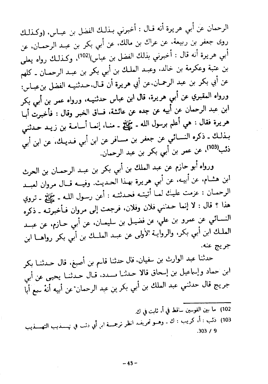 الرحمان عَنْ أَبِي هُرَيْرَةَ أَنَّهُ قَالَ أَخْبَرَنِي بِذَلِكَ الْفَضْلُ بْنُ عَبَّاسٍ (وَكَذَلِكَ رَوَى جَعْفَرِ بْنِ رَبِيعَةَ عَنْ عِرَاكِ بْنِ مَالِكٍ عَنْ أَبِي بكر بن عبد الرحمان عَنْ أَبِي هُرَيْرَةَ أَنَّهُ قَالَ أَخْبَرَنِي بِذَلِكَ الْفَضْلُ بْنُ عَبَّاسٍ) وَكَذَلِكَ رَوَاهُ يَعْلَى بْنُ عُتْبَةَ وَعِكْرِمَةُ بْنُ خَالِدٍ وَعَبْدِ الْمَلِكِ بْنِ أَبِي بَكْرِ بْنِ عَبْدِ الرحمان كلهم عن أبي بكر بن عبد الرحمان عَنْ أَبِي هُرَيْرَةَ أَنْ قَالَ حَدَّثَنِيهِ الْفَضْلُ بْنُ عَبَّاسٍ وَرَوَاهُ الْمَقْبُرِيُّ عَنْ أَبِي هُرَيْرَةَ قَالَ ابْنُ عَبَّاسٍ حَدَّثَنِيهِ وَرَوَاهُ عُمَرُ بْنُ أبي بكر ابن عبد الرحمان عَنْ أَبِيهِ عَنْ جَدِّهِ عَنْ عَائِشَةَ فَسَاقَ الْخَبَرَ وَقَالَ فَأَخْبَرْتُ أَبَا هُرَيْرَةَ فَقَالَ هِيَ أَعْلَمُ بِرَسُولِ اللَّهِ صَلَّى اللَّهُ عَلَيْهِ وَسَلَّمَ مِنَّا إِنَّمَا أُسَامَةُ بْنُ زَيْدٍ حَدَّثَنِي بِذَلِكَ ذَكَرَهُ النَّسَائِيُّ عَنْ جَعْفَرِ بْنِ مُسَافِرٍ عَنِ ابْنِ أَبِي فُدَيْكٍ عَنِ ابْنِ أَبِي ذِئْبٍ عَنْ عُمَرَ بْنِ أَبِي بَكْرِ بْنِ عَبْدِ الرحمان وَرَوَاهُ أَبُو حَازِمٍ عَنْ عَبْدِ الْمَلِكِ بْنِ أَبِي بَكْرِ بْنِ عبد الرحمان بن الحرث ابن هِشَامٍ عَنْ أَبِيهِ عَنْ أَبِي هُرَيْرَةَ بِهَذَا الحديث وفيه قال مروان لعبد الرحمان عَزَمْتُ عَلَيْكَ لَمَا أَتَيْتَهُ فَحَدَّثْتَهُ أَعَنْ رَسُولِ اللَّهِ صَلَّى اللَّهُ عَلَيْهِ وَسَلَّمَ تَرْوِي هَذَا قَالَ لَا إِنَّمَا حَدَّثَنِي فُلَانٌ وَفُلَانٌ فَرَجَعْتُ إِلَى مَرْوَانَ فَأَخْبَرْتُهُ ذَكَرَهُ النَّسَائِيُّ عَنْ عَمْرِو بْنِ عَلِيٍّ عَنْ فُضَيْلِ بْنِ سُلَيْمَانَ عَنْ أَبِي حَازِمٍ عَنْ عَبْدِ الْمَلِكِ بْنِ أَبِي بَكْرٍ وَالرِّوَايَةُ الْأُولَى عَنْ عَبْدِ الْمَلِكِ بْنِ أَبِي بَكْرٍ رَوَاهَا ابْنُ جُرَيْجٍ عَنْهُ حَدَّثَنَا عَبْدُ الْوَارِثِ بْنُ سُفْيَانَ قَالَ حَدَّثَنَا قاسم بن أصبغ قال حدثنا بكر ابن حَمَّادٍ وَإِسْمَاعِيلُ بْنُ إِسْحَاقَ قَالَا حَدَّثَنَا مُسَدَّدٌ قَالَ حَدَّثَنَا يَحْيَى عَنْ أَبِي جُرَيْجٍ قَالَ حَدَّثَنِي عَبْدِ الْمَلِكِ بْنِ أَبِي بَكْرِ بْنِ عَبْدِ الرحمان عَنْ أَبِيهِ أَنَّهُ سَمِعَ أَبَا