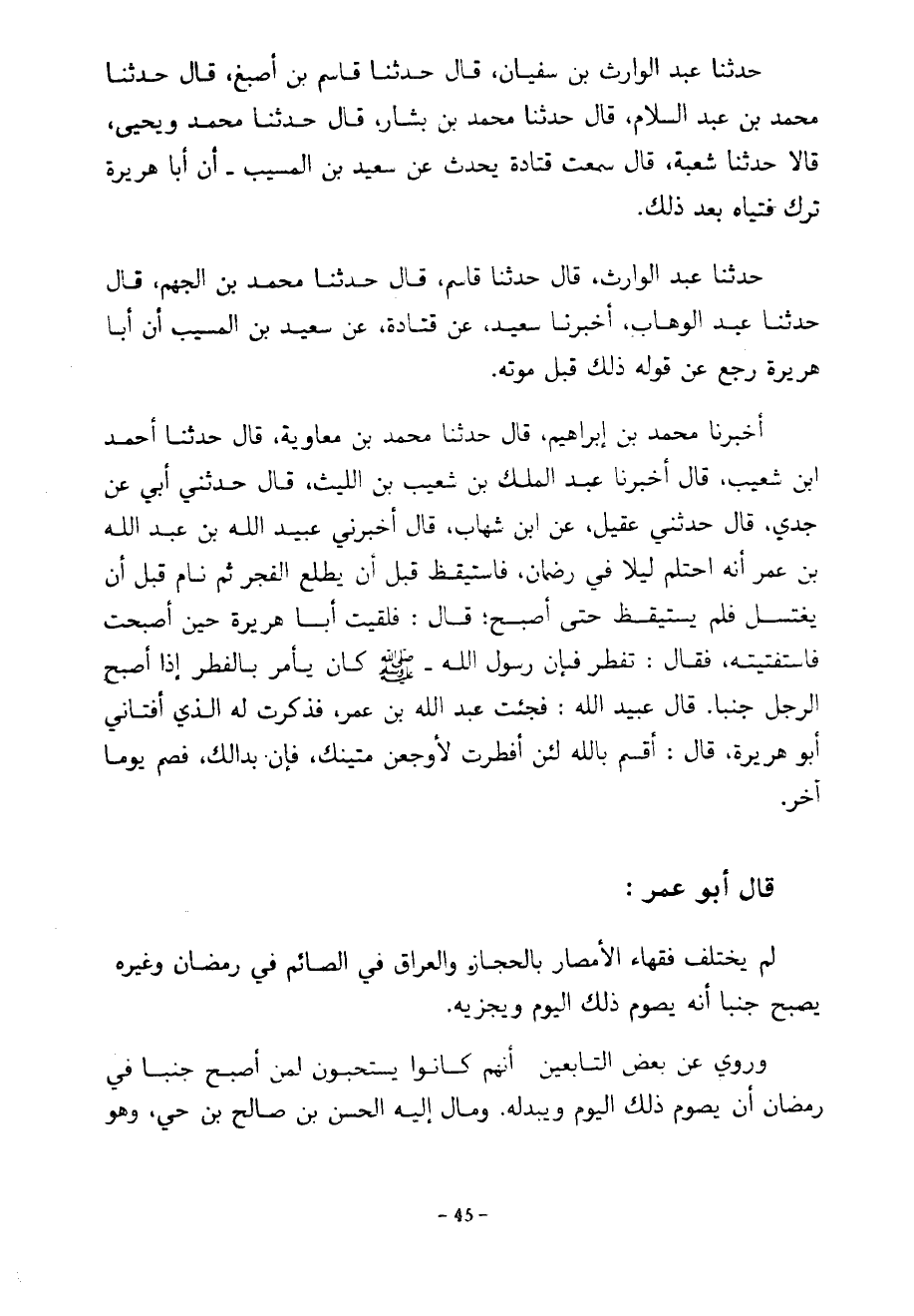 حَدَّثَنَا عَبْدُ الْوَارِثِ بْنُ سُفْيَانَ قَالَ حَدَّثَنَا قَاسِمُ بْنُ أَصْبَغَ قَالَ حَدَّثَنَا مُحَمَّدُ بْنُ عَبْدِ السَّلَامِ قَالَ حَدَّثَنَا مُحَمَّدُ بْنُ بَشَّارٍ قَالَ حَدَّثَنَا مُحَمَّدٌ وَيَحْيَى قَالَا حَدَّثَنَا شُعْبَةُ قَالَ سَمِعْتُ قَتَادَةَ يُحَدِّثُ عَنْ سَعِيدِ بْنِ الْمُسَيَّبِ أَنَّ أَبَا هُرَيْرَةَ تَرَكَ فُتْيَاهُ بَعْدَ ذَلِكَ حَدَّثَنَا عَبْدُ الْوَارِثِ قَالَ حَدَّثَنَا قَاسِمٌ قَالَ حَدَّثَنَا مُحَمَّدُ بْنُ الْجَهْمِ قَالَ حَدَّثَنَا عَبْدُ الْوَهَّابِ أَخْبَرَنَا سَعِيدٌ عَنْ قَتَادَةَ عَنْ سَعِيدِ بْنِ الْمُسَيَّبِ أَنَّ أَبَا هُرَيْرَةَ رَجَعَ عَنْ قَوْلِهِ ذَلِكَ قَبْلَ مَوْتِهِ أَخْبَرَنَا مُحَمَّدُ بْنُ إِبْرَاهِيمَ قَالَ حَدَّثَنَا مُحَمَّدُ بْنُ مُعَاوِيَةَ قال حدثنا أحمد ابن شُعَيْبٍ قَالَ أَخْبَرَنَا عَبْدُ الْمَلِكِ بْنِ شُعَيْبِ بْنِ اللَّيْثِ قَالَ حَدَّثَنِي أَبِي عَنْ جَدِّي قَالَ حَدَّثَنِي عَقِيلٌ عَنِ ابْنِ شِهَابٍ قَالَ أَخْبَرَنِي عُبَيْدُ اللَّهِ بْنُ عَبْدِ اللَّهِ بْنِ عُمَرَ أَنَّهُ احْتَلَمَ لَيْلًا فِي رَمَضَانَ فَاسْتَيْقَظَ قَبْلَ أَنْ يَطْلُعَ الْفَجْرُ ثُمَّ نَامَ قَبْلَ أَنْ يَغْتَسِلَ فَلَمْ يَسْتَيْقِظْ حَتَّى أَصْبَحَ قَالَ فَلَقِيتُ أَبَا هُرَيْرَةَ حِينَ أَصْبَحْتُ فَاسْتَفْتَيْتُهُ فَقَالَ تُفْطِرُ فَإِنَّ رَسُولَ اللَّهِ صَلَّى اللَّهُ عَلَيْهِ وَسَلَّمَ كَانَ يَأْمُرُ بِالْفِطْرِ إِذَا أَصْبَحَ الرَّجُلُ جُنُبًا قَالَ عُبَيْدُ اللَّهِ فَجِئْتُ عَبْدَ اللَّهِ بْنَ عُمَرَ فَذَكَرْتُ لَهُ الَّذِي أَفْتَانِي أَبُو هُرَيْرَةَ قَالَ أُقْسِمُ بِاللَّهِ لَئِنْ أَفْطَرْتَ لَأُوجِعَنَّ متينك فإن بدالك فَصُمْ يَوْمًا آخَرَ قَالَ أَبُو عُمَرَ لَمْ يَخْتَلِفْ فُقَهَاءُ الْأَمْصَارِ بِالْحِجَازِ وَالْعِرَاقِ فِي الصَّائِمِ فِي رَمَضَانَ وَغَيْرِهِ يُصْبِحُ جُنُبًا أَنَّهُ يَصُومُ ذَلِكَ الْيَوْمَ وَيُجْزِيهِ وَرُوِيَ عَنْ بَعْضِ التَّابِعِينَ أَنَّهُمْ كَانُوا يَسْتَحِبُّونَ لِمَنْ أَصْبَحَ جُنُبًا فِي رَمَضَانَ أَنْ يَصُومَ ذَلِكَ الْيَوْمَ وَيُبَدِّلَهُ وَمَالَ إِلَيْهِ الْحَسَنُ بْنُ صَالِحِ بْنِ حَيٍّ وَهُوَ