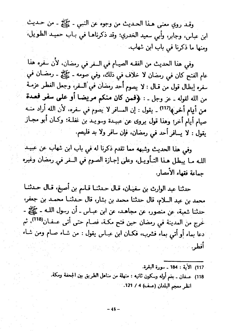 وَقَدْ رُوِيَ مَعْنَى هَذَا الْحَدِيثِ مِنْ وُجُوهٍ عَنِ النَّبِيِّ صَلَّى اللَّهُ عَلَيْهِ وسلم من حَدِيثِ ابْنِ عَبَّاسٍ وَجَابِرٍ وَأَبِي سَعِيدٍ الْخُدْرِيِّ وَقَدْ ذَكَرْنَاهَا فِي بَابِ حُمَيْدٍ الطَّوِيلِ وَمِنْهَا مَا ذَكَرْنَا فِي بَابِ ابْنِ شِهَابٍ وَفِي هَذَا الْحَدِيثِ مِنَ الْفِقْهِ الصِّيَامُ فِي السَّفَرِ فِي رَمَضَانَ لِأَنَّ سَفَرَهُ هَذَا عَامَ الْفَتْحِ كَانَ فِي رَمَضَانَ لَا خِلَافَ فِي ذَلِكَ وَفِي صَوْمِهِ صَلَّى اللَّهُ عَلَيْهِ وَسَلَّمَ رَمَضَانَ فِي سَفَرِهِ إِبْطَالُ قَوْلِ مَنْ قَالَ لَا يَصُومُ أَحَدٌ رَمَضَانَ فِي السَّفَرِ وَجَعَلَ الْفِطْرَ عَزْمَةً مِنَ اللَّهِ لِقَوْلِهِ عَزَّ وَجَلَّ فَمَنْ كَانَ مِنْكُمْ مَرِيضًا أَوْ عَلَى سَفَرٍ فَعِدَّةٌ مِنْ أَيَّامٍ أُخَرَ يَقُولُ إِنَّ الْمُسَافِرَ لَا يَصُومُ فِي سَفَرِهِ لِأَنَّ اللَّهَ أَرَادَ مِنْهُ صِيَامَ أَيَّامٍ أُخَرَ وَهَذَا قَوْلٌ يُرْوَى عَنْ عُبَيْدَةَ وَسُوِيدِ بْنِ غَفَلَةَ وَكَانَ أَبُو مَجَازٍ يَقُولُ لَا يُسَافِرُ أَحَدٌ فِي رَمَضَانَ فَإِنْ سَافَرَ وَلَا بُدَّ فَلْيَصُمْ وَفِي هَذَا الْحَدِيثِ وَشِبْهِهِ مِمَّا تَقَدَّمَ ذِكْرُنَا لَهُ فِي بَابِ ابْنِ شِهَابٍ عَنْ عُبَيْدِ اللَّهِ مَا يُبْطِلُ هَذَا التَّأْوِيلَ وَعَلَى إِجَازَةِ الصَّوْمِ فِي السَّفَرِ فِي رَمَضَانَ وَغَيْرِهِ جَمَاعَةُ فُقَهَاءِ الْأَمْصَارِ حَدَّثَنَا عَبْدُ الْوَارِثِ بْنُ سُفْيَانَ قَالَ حَدَّثَنَا قَاسِمُ بْنُ أَصْبَغَ قَالَ حَدَّثَنَا مُحَمَّدُ بْنُ عَبْدِ السَّلَامِ قَالَ حَدَّثَنَا مُحَمَّدُ بْنُ بَشَّارٍ قَالَ حَدَّثَنَا مُحَمَّدُ بْنُ جَعْفَرٍ حَدَّثَنَا شُعْبَةُ عَنْ مَنْصُورٍ عَنْ مُجَاهِدٌ عَنِ ابْنِ عَبَّاسٍ أَنَّ رَسُولَ اللَّهِ صَلَّى اللَّهُ عَلَيْهِ وَسَلَّمَ خَرَجَ مِنَ الْمَدِينَةِ فِي رَمَضَانَ حِينَ فَتَحَ مَكَّةَ فَصَامَ حَتَّى أَتَى عُسْفَانَ ثُمَّ دَعَا بِمَاءٍ أَوْ أُتِيَ بِمَاءٍ فَشَرِبَ فَكَانَ ابْنُ عَبَّاسٍ يَقُولُ مَنْ شَاءَ صَامَ وَمَنْ شَاءَ أَفْطَرَ