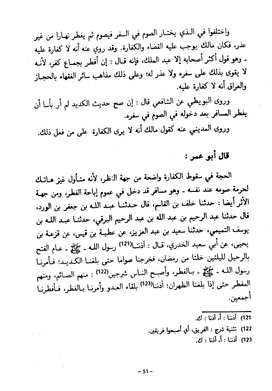 وَاخْتَلَفُوا فِي الَّذِي يَخْتَارُ الصَّوْمَ فِي السَّفَرِ فَيَصُومُ ثُمَّ يُفْطِرُ نَهَارًا مِنْ غَيْرِ عُذْرٍ فَكَانَ مَالِكٌ يُوجِبُ عَلَيْهِ الْقَضَاءَ وَالْكَفَّارَةَ وَقَدْ رُوِيَ عَنْهُ أَنَّهُ لَا كَفَّارَةَ عَلَيْهِ وَهُوَ قَوْلُ أَكْثَرِ أَصْحَابِهِ إِلَّا عَبْدَ الْمَلِكِ فَإِنَّهُ قَالَ إِنْ أَفْطَرَ بِجِمَاعٍ كَفَّرَ لِأَنَّهُ لَا يَقْوَى بِذَلِكَ عَلَى سَفَرِهِ وَلَا عُذْرَ لَهُ وَعَلَى ذَلِكَ مَذَاهِبُ سَائِرِ الْفُقَهَاءِ بِالْحِجَازِ وَالْعِرَاقِ أَنَّهُ لَا كَفَّارَةَ عَلَيْهِ وَرَوَى الْبُوَيْطِيُّ عَنِ الشَّافِعِيِّ قَالَ إِنْ صَحَّ حَدِيثُ الْكَدِيدِ لَمْ أَرَ بَأْسًا أَنْ يُفْطِرَ الْمُسَافِرُ بَعْدَ دُخُولِهِ فِي الصَّوْمِ فِي سَفَرِهِ وَرَوَى الْمَدِينِيُّ عَنْهُ كَقَوْلِ مَالِكٍ أَنَّهُ لَا يَرَى الْكَفَّارَةَ عَلَى مَنْ فَعَلَ ذَلِكَ قَالَ أَبُو عُمَرَ الْحُجَّةُ فِي سُقُوطِ الْكَفَّارَةِ وَاضِحَةٌ مِنْ جِهَةِ النَّظَرِ لِأَنَّهُ مُتَأَوِّلٌ غَيْرُ هَاتِكٍ لِحُرْمَةِ صَوْمِهِ عِنْدَ نَفْسِهِ وَهُوَ مُسَافِرٌ قَدْ دَخَلَ فِي عُمُومِ إِبَاحَةِ الْفِطْرِ وَمِنْ جِهَةِ الْأَثَرِ أَيْضًا حَدَّثَنَا خَلَفُ بْنُ الْقَاسِمِ قَالَ حَدَّثَنَا عَبْدُ اللَّهِ بْنُ جَعْفَرِ بْنِ الْوَرْدِ قَالَ حَدَّثَنَا عَبْدُ الرَّحِيمِ بْنُ عَبْدِ اللَّهِ بْنِ عَبْدِ الرَّحِيمِ الْبَرْقِيُّ حَدَّثَنَا عَبْدُ اللَّهِ بْنُ يُوسُفَ التَّمِيمِيُّ حَدَّثَنَا سَعِيدُ بْنُ عَبْدِ الْعَزِيزِ عَنْ عَطِيَّةَ بْنِ قَيْسٍ عَنْ قَزْعَةَ بْنِ يَحْيَى عَنْ أَبِي سَعِيدٍ الْخُدْرِيِّ قَالَ آذَنَنَا رَسُولُ اللَّهِ صَلَّى اللَّهُ عَلَيْهِ وَسَلَّمَ عَامَ الْفَتْحِ بِالرَّحِيلِ لِلَيْلَتَيْنِ خَلَتَا مِنْ رَمَضَانَ فَخَرَجْنَا صُوَّامًا حَتَّى بَلَغْنَا الْكَدِيدَ فَأَمَرَنَا رَسُولُ اللَّهِ صَلَّى اللَّهُ عَلَيْهِ وَسَلَّمَ بِالْفِطْرِ وَأَصْبَحَ النَّاسُ شَرْجَيْنِ مِنْهُمُ الصَّائِمُ وَمِنْهُمُ الْمُفْطِرُ حَتَّى إِذَا بَلَغْنَا الظَّهْرَانَ آذَنَنَا بِلِقَاءِ الْعَدُوِّ وَأَمَرَنَا بِالْفِطْرِ فَأَفْطَرْنَا أَجْمَعِينَ