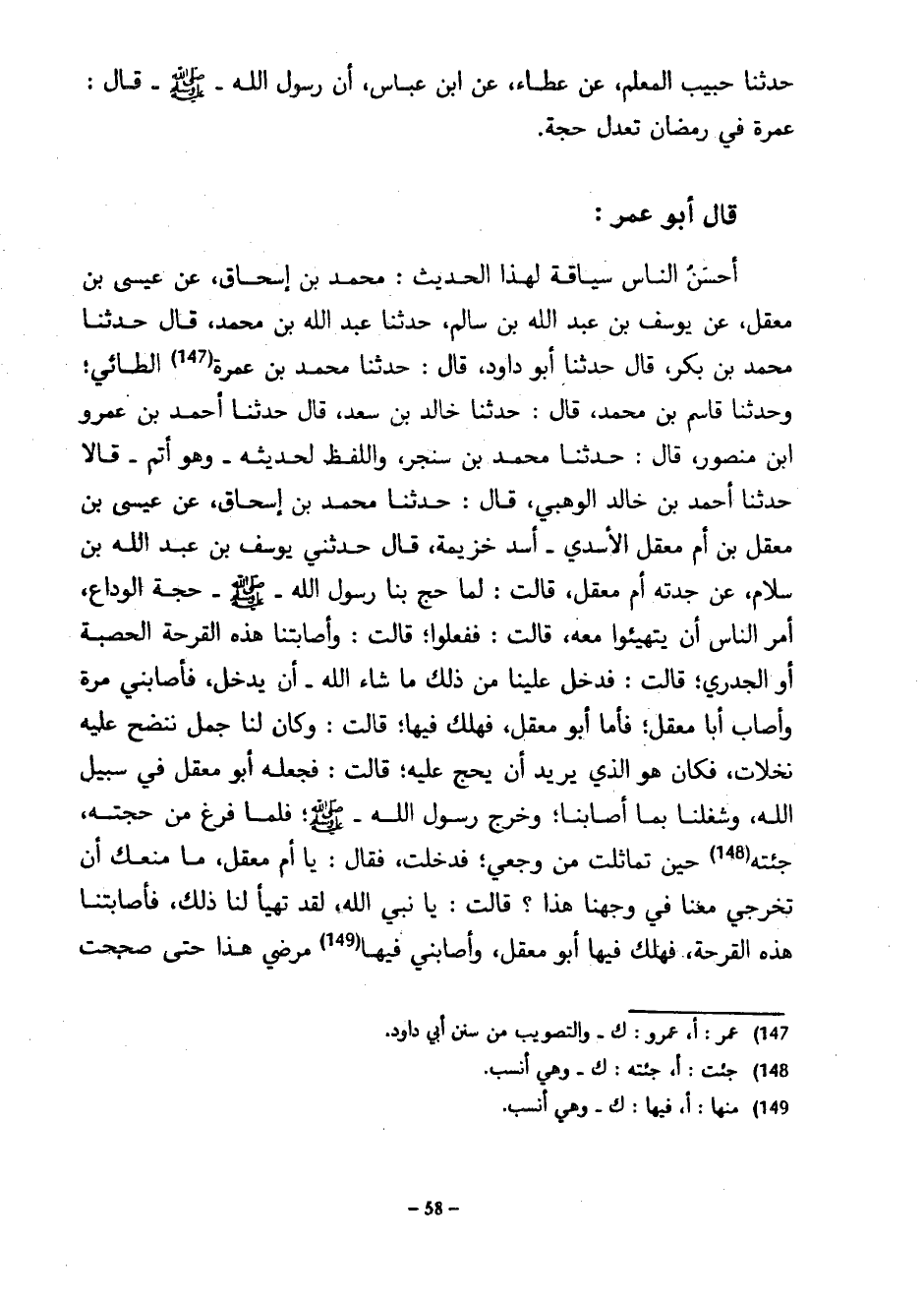 حَدَّثَنَا حَبِيبٌ الْمُعَلِّمُ عَنْ عَطَاءٍ عَنِ ابْنِ عَبَّاسٍ أَنَّ رَسُولَ اللَّهِ صَلَّى اللَّهُ عَلَيْهِ وَسَلَّمَ قَالَ عُمْرَةٌ فِي رَمَضَانَ تَعْدِلُ حَجَّةً قَالَ أَبُو عُمَرَ أَحْسَنُ النَّاسِ سِيَاقَةً لِهَذَا الْحَدِيثِ مُحَمَّدُ بْنُ إِسْحَاقَ عَنْ عِيسَى بْنِ مَعْقِلٍ عَنْ يُوسُفَ بْنِ عَبْدِ اللَّهِ بْنِ سَالِمٍ حَدَّثَنَا عَبْدُ اللَّهِ بْنُ مُحَمَّدٍ قَالَ حَدَّثَنَا مُحَمَّدُ بْنُ بَكْرٍ قَالَ حَدَّثَنَا أَبُو دَاوُدَ قَالَ حَدَّثَنَا مُحَمَّدُ بْنُ عَمْرَةَ الطَّائِيُّ وَحَدَّثَنَا قَاسِمُ بْنُ مُحَمَّدٍ قَالَ حَدَّثَنَا خَالِدُ بْنُ سَعْدٍ قَالَ حَدَّثَنَا أَحْمَدُ بْنُ عَمْرِو ابن مَنْصُورٍ قَالَ حَدَّثَنَا مُحَمَّدُ بْنُ سَنْجَرٍ وَاللَّفْظُ لِحَدِيثِهِ وَهُوَ أَتَمُّ قَالَا حَدَّثَنَا أَحْمَدُ بْنُ خَالِدٍ الْوَهْبِيُّ قَالَ حَدَّثَنَا مُحَمَّدُ بْنُ إِسْحَاقَ عن عيسى بن معقل بن أُمِّ مَعْقِلٍ الْأَسَدِيِّ أَسَدِ خُزَيْمَةَ قَالَ حَدَّثَنِي يُوسُفُ بْنُ عَبْدِ اللَّهِ بْنِ سَلَامٍ عَنْ جَدَّتِهِ أُمِّ مَعْقِلٍ قَالَتْ لَمَّا حَجَّ بِنَا رَسُولُ اللَّهِ صَلَّى اللَّهُ عَلَيْهِ وَسَلَّمَ حَجَّةَ الْوَدَاعِ أَمَرَ النَّاسَ أَنْ يَتَهَيَّئُوا مَعَهُ قَالَتْ فَفَعَلُوا قَالَتْ وَأَصَابَتْنَا هَذِهِ الْقُرْحَةُ الْحَصْبَةُ أَوِ الْجُدَرِيُّ قَالَتْ فَدَخَلَ عَلَيْنَا مِنْ ذَلِكَ مَا شَاءَ اللَّهُ أَنْ يَدْخُلَ فَأَصَابَنِي مَرَّةً وَأَصَابَ أَبَا مَعْقِلٍ فَأَمَّا أَبُو مَعْقِلٍ فَهَلَكَ فِيهَا قَالَتْ وَكَانَ لَنَا جَمَلٌ نَنْضِحُ عَلَيْهِ نَخَلَاتٍ فَكَانَ هُوَ الَّذِي يُرِيدُ أَنْ يَحُجَّ عَلَيْهِ قَالَتْ فَجَعَلَهُ أَبُو مَعْقِلٍ فِي سَبِيلِ اللَّهِ وَشُغِلْنَا بِمَا أَصَابَنَا وَخَرَجَ رَسُولُ اللَّهِ صَلَّى اللَّهُ عَلَيْهِ وَسَلَّمَ فَلَمَّا فَرَغَ مِنْ حَجَّتِهِ جئته حين تماثلت من وجعي فدخلت فَقَالَ يَا أُمَّ مَعْقِلٍ مَا مَنَعَكِ أَنَّ تَخْرُجِي مَعَنَا فِي وَجْهِنَا هَذَا قَالَتْ يَا نَبِيَّ اللَّهِ لَقَدْ تَهَيَّأَ لَنَا ذَلِكَ فَأَصَابَتْنَا هَذِهِ الْقُرْحَةُ فَهَلَكَ فِيهَا أَبُو مَعْقِلٍ وَأَصَابَنِي فِيهَا مَرَضِي هَذَا حَتَّى صَحَحْتُ