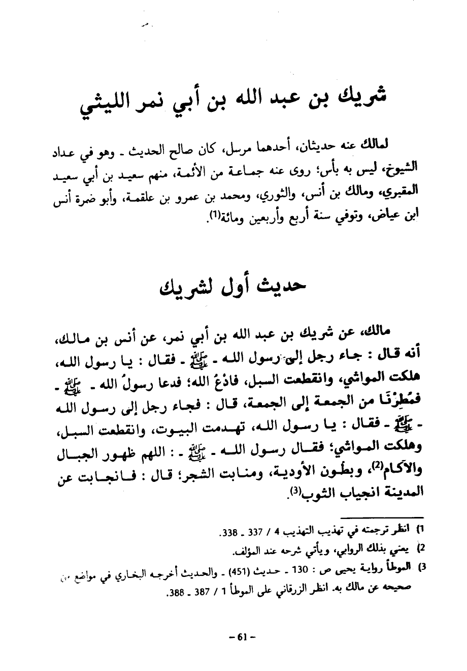 حَدِيثٌ أَوَّلُ لِشَرِيكٍ مَالِكٌ عَنْ شَرِيكِ بْنِ عَبْدِ اللَّهِ بْنِ أَبِي نَمِرٍ عَنْ أَنَسِ بْنِ مَالِكٍ أَنَّهُ قَالَ جَاءَ رَجُلٌ إِلَى رَسُولِ اللَّهِ صَلَّى اللَّهُ عَلَيْهِ وَسَلَّمَ فَقَالَ يَا رَسُولَ اللَّهِ هَلَكَتِ الْمَوَاشِي وَانْقَطَعَتِ السُّبُلُ فَادْعُ اللَّهَ فَدَعَا رَسُولُ اللَّهِ صَلَّى اللَّهُ عَلَيْهِ وَسَلَّمَ فَمُطِرْنَا مِنَ الْجُمُعَةِ إِلَى الْجُمُعَةِ قَالَ فَجَاءَ رَجُلٌ إِلَى رَسُولِ اللَّهِ صَلَّى اللَّهُ عَلَيْهِ وَسَلَّمَ فَقَالَ يَا رَسُولَ اللَّهِ تَهَدَّمَتِ الْبُيُوتُ وَانْقَطَعَتِ السُّبُلُ وَهَلَكَتِ الْمَوَاشِي فَقَالَ رَسُولُ اللَّهِ صَلَّى اللَّهُ عَلَيْهِ وَسَلَّمَ اللَّهُمَّ ظُهُورَ الْجِبَالِ وَالْآكَامِ وَبُطُونَ الْأَوْدِيَةِ وَمَنَابِتَ الشَّجَرِ قَالَ فَانْجَابَتْ عَنِ الْمَدِينَةِ انْجِيَابَ الثَّوْبِ