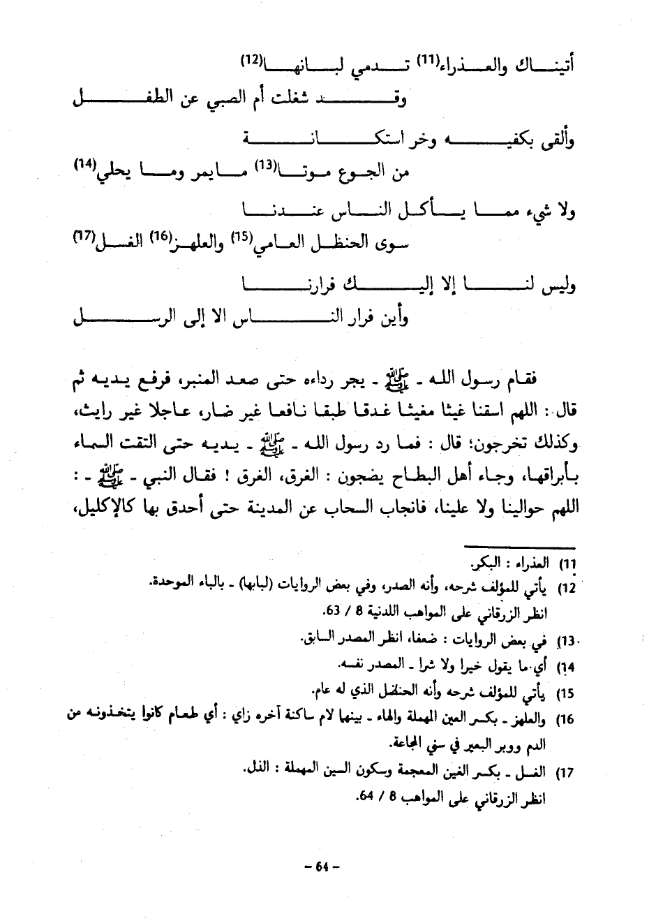 أَتَيْنَاكَ وَالْعَذْرَاءُ تُدْمِي لَبَانَهَا ... وَقَدْ شُغِلَتْ أُمُّ الصَّبِيِّ عَنِ الطِّفْلِ ... ... وَأَلْقَى بِكَفَّيْهِ وَخَرَّ اسْتِكَانَةً ... مِنَ الْجُوعِ مَوْتًا مَا يُمِرُّ وَمَا يُحْلِي ... ... وَلَا شَيْءَ مِمَّا يَأْكُلُ النَّاسُ عِنْدَنَا ... ... سِوَى الحنظل العامي والعلهز الغسل ... وَلَيْسَ لَنَا إِلَّا إِلَيْكَ فِرَارُنَا ... وَأَيْنَ فِرَارُ النَّاسِ إِلَّا إِلَى الرُّسْلِ ... فَقَامَ رَسُولُ اللَّهِ صَلَّى اللَّهُ عَلَيْهِ وَسَلَّمَ يَجُرُّ رِدَاءَهُ حَتَّى صَعِدَ الْمِنْبَرَ فَرَفَعَ يَدَيْهِ ثُمَّ قَالَ اللَّهُمَّ اسْقِنَا غَيْثًا مُغِيثًا غَدَقًا طَبَقًا نَافِعًا غَيْرَ ضَارٍّ عَاجِلًا غَيْرَ رَايِثٍ وَكَذَلِكَ تُخْرَجُونَ قَالَ فَمَا رَدَّ رَسُولُ اللَّهِ صَلَّى اللَّهُ عَلَيْهِ وَسَلَّمَ يَدَيْهِ حَتَّى الْتَقَتِ السَّمَاءُ بِأَبْرَاقِهَا وَجَاءَ أَهْلُ الْبِطَاحِ يَضِجُّونَ الْغَرَقَ الْغَرَقَ فَقَالَ النَّبِيُّ صَلَّى اللَّهُ عَلَيْهِ وَسَلَّمَ اللَّهُمَّ حَوَالَيْنَا وَلَا عَلَيْنَا فَانْجَابَ السَّحَابُ عَنِ الْمَدِينَةِ حَتَّى أَحْدَقَ بها كالإكليل