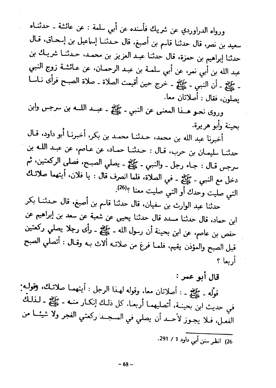 وَرَوَاهُ الدَّرَاوَرْدِيُّ عَنْ شَرِيكٍ فَأَسْنَدَهُ عَنْ أَبِي سَلَمَةَ عَنْ عَائِشَةَ حَدَّثَنَاهُ سَعِيدُ بْنُ نَصْرٍ قَالَ حَدَّثَنَا قَاسِمُ بْنُ أَصْبَغَ قَالَ حَدَّثَنَا إِسْمَاعِيلُ بْنُ إِسْحَاقَ قَالَ حَدَّثَنَا إِبْرَاهِيمُ بْنُ حَمْزَةَ قَالَ حَدَّثَنَا عَبْدُ الْعَزِيزِ بْنُ مُحَمَّدٍ حَدَّثَنَا شَرِيكُ بْنُ عَبْدِ اللَّهِ بْنِ أَبِي نَمِرٍ عَنْ أَبِي سَلَمَةَ بْنِ عبد الرحمان عَنْ عَائِشَةَ زَوْجَ النَّبِيِّ صَلَّى اللَّهُ عَلَيْهِ وَسَلَّمَ أَنَّ النَّبِيَّ صَلَّى اللَّهُ عَلَيْهِ وَسَلَّمَ خَرَجَ حِينَ أُقِيمَتِ الصَّلَاةُ صَلَاةُ الصُّبْحِ فَرَأَى نَاسًا يُصَلُّونَ فَقَالَ أَصَلَاتَانِ مَعًا وَرَوَى نَحْوَ هَذَا الْمَعْنَى عَنِ النَّبِيِّ صَلَّى اللَّهُ عَلَيْهِ وَسَلَّمَ عَبْدُ اللَّهِ بْنُ سَرْجِسَ وَابْنُ بُحَيْنَةَ وَأَبُو هُرَيْرَةَ أَخْبَرَنَا عَبْدُ اللَّهِ بْنُ مُحَمَّدٍ حَدَّثَنَا مُحَمَّدُ بْنُ بَكْرٍ أَخْبَرَنَا أَبُو دَاوُدَ قَالَ حَدَّثَنَا سُلَيْمَانُ بْنُ حَرْبٍ قَالَ حَدَّثَنَا حَمَّادٌ عَنْ عَاصِمٍ عَنْ عَبْدِ اللَّهِ بْنِ سَرْجَسٍ قَالَ جَاءَ رَجُلٌ وَالنَّبِيُّ صَلَّى اللَّهُ عَلَيْهِ وَسَلَّمَ يُصَلِّي الصُّبْحَ فَصَلَّى الرَّكْعَتَيْنِ ثُمَّ دَخَلَ مَعَ النَّبِيِّ صَلَّى اللَّهُ عَلَيْهِ وَسَلَّمَ فِي الصَّلَاةِ فَلَمَّا انْصَرَفَ قَالَ يَا فُلَانُ أَيَّتُهُمَا صَلَاتُكَ الَّتِي صَلَّيْتَ وَحْدَكَ أَوِ الَّتِي صَلَّيْتَ مَعَنَا حَدَّثَنَا عَبْدُ الْوَارِثِ بْنُ سُفْيَانَ قَالَ حَدَّثَنَا قَاسِمُ بْنُ أَصْبَغَ قال حدثنا بكر ابن حَمَّادٍ قَالَ حَدَّثَنَا مُسَدَّدٌ قَالَ حَدَّثَنَا يَحْيَى عَنْ شُعْبَةَ عَنْ سَعْدِ بْنِ إِبْرَاهِيمَ عَنْ حَفْصِ بْنِ عَاصِمٍ عَنِ ابْنِ بُحَيْنَةَ أَنَّ رَسُولَ اللَّهِ صَلَّى اللَّهُ عَلَيْهِ وَسَلَّمَ رَأَى رَجُلًا يُصَلِّي رَكْعَتَيْنِ قَبْلَ الصُّبْحِ وَالْمُؤَذِّنُ يُقِيمُ فَلَمَّا فَرَغَ مِنْ صَلَاتِهِ أَلَاثَ بِهِ وَقَالَ أَتُصَلِّي الصُّبْحَ أَرْبَعًا قَالَ أَبُو عُمَرَ قَوْلُهُ صَلَّى اللَّهُ عَلَيْهِ وَسَلَّمَ أَصَلَاتَانِ مَعًا وَقَوْلُهُ لِهَذَا الرَّجُلِ أَيَّتُهُمَا صَلَاتُكَ وَقَوْلُهُ فِي حَدِيثِ ابْنِ بُحَيْنَةَ أَتُصَلِّيهِمَا أَرْبَعًا كُلُّ ذَلِكَ إِنْكَارٌ مِنْهُ صَلَّى اللَّهُ عَلَيْهِ وَسَلَّمَ لِذَلِكَ الْفِعْلِ فَلَا يَجُوزُ لِأَحَدٍ أَنْ يُصَلِّيَ فِي الْمَسْجِدِ ركعتي الفجر ولا شيئا فيمن