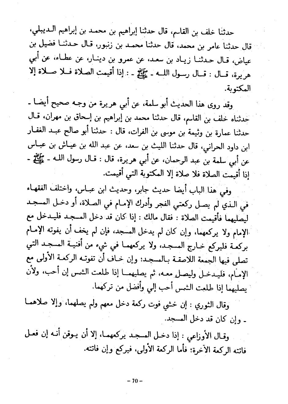 حَدَّثَنَا خَلَفُ بْنُ الْقَاسِمِ قَالَ حَدَّثَنَا إِبْرَاهِيمُ بْنُ مُحَمَّدِ بْنِ إِبْرَاهِيمَ الدَّيْبُلِيُّ قَالَ حَدَّثَنَا عَامِرُ بْنُ مُحَمَّدٍ قَالَ حَدَّثَنَا مُحَمَّدُ بْنُ زَنْبُورٍ قَالَ حَدَّثَنَا فُضَيْلُ بْنُ عِيَاضٍ قَالَ حَدَّثَنَا زِيَادِ بْنِ سَعْدٍ عَنْ عَمْرِو بْنِ دِينَارٍ عَنْ عَطَاءٍ عَنْ أَبِي هُرَيْرَةَ قَالَ قَالَ رَسُولُ اللَّهِ صَلَّى اللَّهُ عَلَيْهِ وَسَلَّمَ إِذَا أُقِيمَتِ الصَّلَاةُ فَلَا صَلَاةَ إِلَّا الْمَكْتُوبَةُ وَقَدْ رَوَى هَذَا الْحَدِيثَ أَبُو سَلَمَةَ عَنْ أَبِي هُرَيْرَةَ مِنْ وَجْهٍ صَحِيحٍ أَيْضًا حَدَّثَنَاهُ خَلَفُ بْنُ الْقَاسِمِ قَالَ حَدَّثَنَا مُحَمَّدُ بْنُ إِبْرَاهِيمَ بْنِ إِسْحَاقَ بْنِ مِهْرَانَ قَالَ حَدَّثَنَا عُمَارَةُ بْنُ وَثِيمَةَ بْنِ مُوسَى بْنِ الْفُرَاتِ قال حدثنا أبو صالح عبد الغفار ابن دَاوُدَ الْحَرَّانِيِّ قَالَ حَدَّثَنَا اللَّيْثُ بْنُ سَعْدٍ عَنْ عَبْدِ اللَّهِ بْنِ عَيَّاشِ بْنِ عَبَّاسٍ عن أبي سلمة بن عبد الرحمان عَنْ أَبِي هُرَيْرَةَ قَالَ قَالَ رَسُولُ اللَّهِ صَلَّى اللَّهُ عَلَيْهِ وَسَلَّمَ إِذَا أُقِيمَتِ الصَّلَاةُ فَلَا صَلَاةَ إِلَّا الْمَكْتُوبَةُ الَّتِي أُقِيمَتْ وَفِي هَذَا الْبَابِ أَيْضًا حَدِيثُ جَابِرٍ وَحَدِيثُ ابْنِ عَبَّاسٍ وَاخْتَلَفَ الْفُقَهَاءُ فِي الَّذِي لَمْ يُصَلِّ رَكْعَتَيِ الْفَجْرِ وَأَدْرَكَ الْإِمَامَ فِي الصَّلَاةِ أَوْ دَخَلَ الْمَسْجِدَ لِيُصَلِّيَهِمَا فَأُقِيمَتِ الصَّلَاةُ فَقَالَ مَالِكٌ إِذَا كَانَ قَدْ دَخَلَ الْمَسْجِدِ فَلْيَدْخُلْ مَعَ الْإِمَامِ وَلَا يَرْكَعْهُمَا وَإِنْ كَانَ لَمْ يَدْخُلِ الْمَسْجِدَ فَإِنْ لَمْ يَخَفْ أَنْ يَفُوتَهُ الْإِمَامُ بِرَكْعَةٍ فَلْيَرْكَعْ خَارِجَ الْمَسْجِدِ وَلَا يَرْكَعْهُمَا فِي شَيْءٍ مِنْ أَفَنِيَةِ الْمَسْجِدِ الَّتِي تُصَلَّى فِيهَا الْجُمُعَةُ اللَّاصِقَةِ بِالْمَسْجِدِ وَإِنْ خَافَ أَنْ تَفُوتَهُ الرَّكْعَةُ الْأُولَى مَعَ الْإِمَامِ فَلْيَدْخُلْ وَلِيُصَلِّ مَعَهُ ثُمَّ يُصَلِّيهِمَا إِذَا طَلَعَتِ الشَّمْسُ إِنْ أَحَبَّ وَلَأَنْ يُصَلِّيَهِمَا إِذَا طَلَعَتِ الشَّمْسُ أَحَبُّ إِلَيَّ وَأَفْضَلُ مِنْ تَرْكِهِمَا وَقَالَ الثَّوْرِيُّ إِنْ خَشِيَ فَوْتَ رَكْعَةٍ دَخَلَ مَعَهُمْ وَلَمْ يُصِلِّهِمَا وَإِلَّا صَلَّاهُمَا وَإِنْ كَانَ قَدْ دَخَلَ الْمَسْجِدَ وَقَالَ الْأَوْزَاعِيُّ إِذَا دَخَلَ الْمَسْجِدَ يَرْكَعُهُمَا إِلَّا أَنْ يُوقِنَ أَنَّهُ إِنْ فَعَلَ فَاتَتْهُ الرَّكْعَةُ الْآخِرَةُ فَأَمَّا الرَّكْعَةُ الْأُولَى فَيَرْكَعُ وَإِنْ فَاتَتْهُ