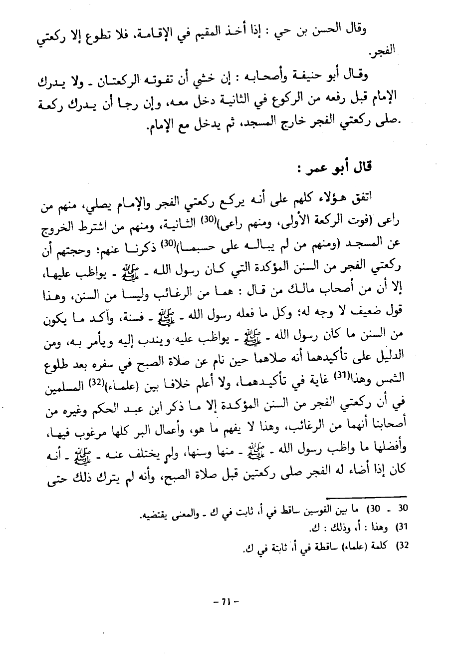 وَقَالَ الْحَسَنُ بْنُ حَيٍّ إِذَا أَخَذَ الْمُقِيمُ فِي الْإِقَامَةِ فَلَا تَطَوُّعَ إِلَّا رَكْعَتَيِ الْفَجْرِ وَقَالَ أَبُو حَنِيفَةَ وَأَصْحَابُهُ إِنْ خَشِيَ أَنْ تَفُوتَهُ الرَّكْعَتَانِ وَلَا يُدْرِكَ الْإِمَامَ قَبْلَ رَفْعِهِ مِنَ الرُّكُوعِ فِي الثَّانِيَةِ دَخَلَ مَعَهُ وَإِنْ رَجَا أَنْ يُدْرِكَ رَكْعَةً صَلَّى رَكْعَتَيِ الْفَجْرِ خَارِجَ الْمَسْجِدِ ثُمَّ يَدْخُلُ مَعَ الْإِمَامِ قَالَ أبو عمر اتفق هؤلاء كلهم على أنه يركع رَكْعَتَيِ الْفَجْرِ وَالْإِمَامُ يُصَلِّي مِنْهُمْ مَنْ رَاعَى (فَوْتَ الرَّكْعَةِ الْأُولَى وَمِنْهُمْ رَاعَى) الثَّانِيَةَ وَمِنْهُمْ مَنِ اشْتَرَطَ الْخُرُوجَ عَنِ الْمَسْجِدِ (وَمِنْهُمْ مَنْ لَمْ يُبَالِهِ عَلَى حَسْبِمَا) ذَكَرْنَا عَنْهُمْ وَحُجَّتُهُمْ أَنَّ رَكْعَتَيِ الْفَجْرِ مِنَ السُّنَنِ الْمُؤَكَّدَةِ الَّتِي كَانَ رَسُولُ اللَّهِ صَلَّى اللَّهُ عَلَيْهِ وَسَلَّمَ يُوَاظِبُ عَلَيْهَا إِلَّا أَنَّ مِنْ أَصْحَابِ مَالِكٍ مَنْ قَالَ هُمَا مِنَ الرَّغَائِبِ وَلَيْسَا مِنَ السُّنَنِ وَهَذَا قَوْلٌ ضَعِيفٌ لَا وَجْهَ لَهُ وَكُلُّ مَا فَعَلَهُ رَسُولُ اللَّهِ صَلَّى اللَّهُ عَلَيْهِ وَسَلَّمَ فَسُنَّةٌ وَآكَدُ مَا يَكُونُ مِنَ السُّنَنِ مَا كَانَ رَسُولُ اللَّهِ صَلَّى اللَّهُ عَلَيْهِ وَسَلَّمَ يُوَاظِبُ عَلَيْهِ وَيَنْدُبُ إِلَيْهِ وَيَأْمُرُ بِهِ وَمِنَ الدَّلِيلِ عَلَى تَأْكِيدِهِمَا أَنَّهُ صَلَّاهُمَا حِينَ نَامَ عَنْ صَلَاةِ الصُّبْحِ فِي سَفَرِهِ بَعْدَ طُلُوعِ الشَّمْسِ وَهَذَا غَايَةٌ فِي تَأْكِيدِهِمَا وَلَا أَعْلَمُ خِلَافًا بَيْنَ (عُلَمَاءِ) الْمُسْلِمِينَ فِي أَنَّ رَكْعَتَيِ الْفَجْرِ مِنَ السُّنَنِ الْمُؤَكَّدَةِ إِلَّا مَا ذَكَرَ ابْنُ عَبْدِ الْحَكَمِ وَغَيْرُهُ مِنْ أَصْحَابِنَا أَنَّهُمَا مِنَ الرَّغَائِبِ وَهَذَا لَا يُفْهَمُ مَا هُوَ وَأَعْمَالُ الْبِرِّ كُلُّهَا مَرْغُوبٌ فِيهَا وَأَفْضَلُهَا مَا وَاظَبَ رَسُولُ اللَّهِ صَلَّى اللَّهُ عَلَيْهِ وَسَلَّمَ مِنْهَا وَسَنَّهَا وَلَمْ يَخْتَلِفْ عَنْهُ صَلَّى اللَّهُ عَلَيْهِ وَسَلَّمَ أَنَّهُ كَانَ إِذَا أَضَاءَ لَهُ الْفَجْرُ صَلَّى رَكْعَتَيْنِ قَبْلَ صَلَاةِ الصُّبْحِ وَأَنَّهُ لَمْ يَتْرُكْ ذَلِكَ حَتَّى