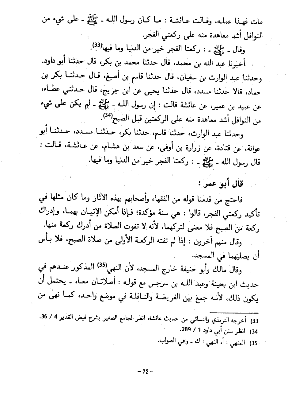 مَاتَ فَهَذَا عَمَلُهُ وَقَالَتْ عَائِشَةُ مَا كَانَ رَسُولُ اللَّهِ صَلَّى اللَّهُ عَلَيْهِ وَسَلَّمَ عَلَى شَيْءٍ مِنَ النَّوَافِلِ أَشَدَّ مُعَاهَدَةً مِنْهُ عَلَى رَكْعَتَيِ الْفَجْرِ وَقَالَ صَلَّى اللَّهُ عَلَيْهِ وَسَلَّمَ رَكْعَتَا الْفَجْرِ خَيْرٌ مِنَ الدُّنْيَا وَمَا فِيهَا أَخْبَرَنَا عَبْدُ اللَّهِ بْنُ مُحَمَّدٍ قَالَ حَدَّثَنَا مُحَمَّدُ بْنُ بَكْرٍ قَالَ حَدَّثَنَا أَبُو دَاوُدَ وَحَدَّثَنَا عَبْدُ الْوَارِثِ بْنُ سُفْيَانَ قَالَ حَدَّثَنَا قَاسِمُ بْنُ أَصْبَغَ قَالَ حَدَّثَنَا بَكْرُ بْنُ حَمَّادٍ قَالَا حَدَّثَنَا مُسَدَّدٌ قَالَ حَدَّثَنَا يَحْيَى عَنِ ابْنِ جُرَيْجٍ قَالَ حَدَّثَنِي عَطَاءٍ عَنْ عُبَيْدِ بْنِ عُمَيْرٍ عَنْ عَائِشَةَ قَالَتْ إِنَّ رَسُولَ اللَّهِ صَلَّى اللَّهُ عَلَيْهِ وَسَلَّمَ لَمْ يَكُنْ عَلَى شَيْءٍ مِنَ النَّوَافِلِ أَشَدَّ مُعَاهَدَةً مِنْهُ عَلَى الرَّكْعَتَيْنِ قَبْلَ الصُّبْحِ وَحَدَّثَنَا عَبْدُ الْوَارِثِ حَدَّثَنَا قَاسِمٌ حَدَّثَنَا بَكْرٌ حَدَّثَنَا مُسَدَّدٌ حَدَّثَنَا أَبُو عَوَانَةَ عَنْ قَتَادَةَ عَنْ زُرَارَةَ بْنِ أَوْفَى عَنْ سَعْدِ بْنِ هِشَامٍ عَنْ عَائِشَةَ قَالَتْ قَالَ رَسُولُ اللَّهِ صَلَّى اللَّهُ عَلَيْهِ وَسَلَّمَ رَكْعَتَا الْفَجْرِ خَيْرٌ مِنَ الدُّنْيَا وَمَا فِيهَا قَالَ أَبُو عُمَرَ فَاحْتَجَّ مَنْ قَدَّمْنَا قَوْلَهُ مِنَ الْفُقَهَاءِ وَأَصْحَابِهِمْ بِهَذِهِ الْآثَارِ وَمَا كَانَ مِثْلَهَا فِي تَأْكِيدِ رَكْعَتَيِ الْفَجْرِ قَالُوا هِيَ سَنَةٌ مُؤَكَّدَةٌ فَإِذَا أَمْكَنَ الْإِتْيَانُ بِهِمَا وَإِدْرَاكُ رَكْعَةٍ مِنَ الصُّبْحِ فَلَا مَعْنَى لِتَرْكِهِمَا لِأَنَّهُ لَا تَفُوتُ الصَّلَاةُ مَنْ أَدْرَكَ رَكْعَةً مِنْهَا وَقَالَ مِنْهُمْ آخَرُونَ إِذَا لَمْ تَفُتْهُ الرَّكْعَةُ الْأُولَى مِنْ صَلَاةِ الصُّبْحِ فَلَا بَأْسَ أَنْ يُصَلِّيَهِمَا فِي الْمَسْجِدِ وَقَالَ مَالِكٌ وَأَبُو حَنِيفَةَ خَارِجَ الْمَسْجِدِ لِأَنَّ النَّهْيَ الْمَذْكُورَ عِنْدَهُمْ فِي حَدِيثِ ابْنِ بُحَيْنَةَ وَعَبْدِ اللَّهِ بْنِ سَرْجِسَ مَعَ قَوْلِهِ أَصَلَاتَانِ مَعًا يُحْتَمَلُ أَنْ يَكُونَ ذَلِكَ لِأَنَّهُ جَمَعَ بَيْنَ الْفَرِيضَةِ وَالنَّافِلَةِ فِي مَوْضِعٍ وَاحِدٍ كَمَا نَهَى مَنْ