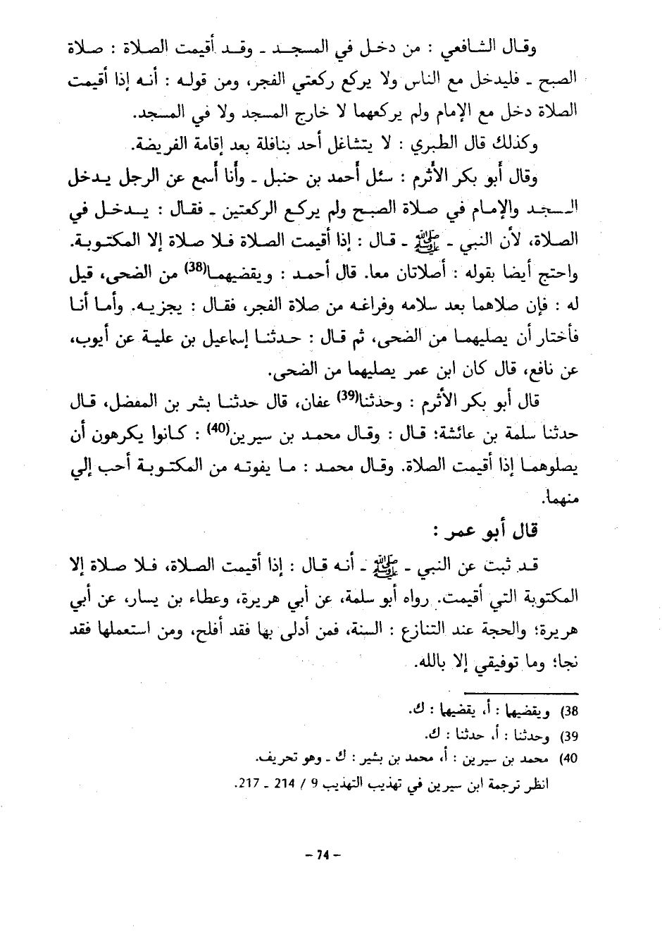 وَقَالَ الشَّافِعِيُّ مَنْ دَخَلَ فِي الْمَسْجِدِ وَقَدْ أُقِيمَتِ الصَّلَاةُ صَلَاةُ الصُّبْحِ فَلْيَدْخُلْ مَعَ النَّاسِ ولا يركع رَكْعَتَيِ الْفَجْرِ وَمِنْ قَوْلِهِ أَنَّهُ إِذَا أُقِيمَتِ الصَّلَاةُ دَخَلَ مَعَ الْإِمَامِ وَلَمْ يَرْكَعْهُمَا لَا خَارِجَ الْمَسْجِدِ وَلَا فِي الْمَسْجِدِ وَكَذَلِكَ قَالَ الطَّبَرِيُّ لَا يَتَشَاغَلُ أَحَدٌ بِنَافِلَةٍ بَعْدَ إِقَامَةِ الْفَرِيضَةِ وَقَالَ أَبُو بَكْرٍ الْأَثْرَمُ سُئِلَ أَحْمَدُ بْنُ حَنْبَلٍ وَأَنَا أَسْمَعُ عَنِ الرَّجُلِ يَدْخُلُ الْمَسْجِدَ وَالْإِمَامُ فِي صَلَاةِ الصُّبْحِ وَلَمْ يَرْكَعِ الرَّكْعَتَيْنِ فَقَالَ يَدْخُلُ فِي الصَّلَاةِ لِأَنَّ النَّبِيَّ صَلَّى اللَّهُ عَلَيْهِ وَسَلَّمَ قَالَ إِذَا أُقِيمَتِ الصَّلَاةُ فَلَا صَلَاةَ إِلَّا الْمَكْتُوبَةُ وَاحْتَجَّ أَيْضًا بِقَوْلِهِ أَصَلَاتَانِ مَعًا قَالَ أَحْمَدُ وَيَقْضِيهِمَا مِنَ الضُّحَى قِيلَ لَهُ فَإِنْ صَلَّاهُمَا بَعْدَ سَلَامِهِ وَفَرَاغِهِ مِنْ صَلَاةِ الْفَجْرِ فَقَالَ يُجْزِيهِ وَأَمَّا أَنَا فَأَخْتَارُ أَنْ يُصَلِّيَهُمَا مِنَ الضُّحَى ثُمَّ قَالَ حَدَّثَنَا إِسْمَاعِيلُ بْنُ عُلَيَّةَ عَنْ أَيُّوبَ عَنْ نَافِعٍ قَالَ كَانَ ابْنُ عُمَرَ يُصَلِّيهِمَا مِنَ الضُّحَى قَالَ أَبُو بَكْرٍ الْأَثْرَمُ وَحَدَّثَنَا عَفَّانُ قَالَ حَدَّثَنَا بِشْرُ بْنُ الْمُفَضَّلِ قَالَ حَدَّثَنَا سَلَمَةُ بْنُ عَائِشَةَ قَالَ وَقَالَ مُحَمَّدُ بْنُ سِيرِينَ كَانُوا يَكْرَهُونَ أَنْ يَصِلُوهُمَا إِذَا أُقِيمَتِ الصَّلَاةُ وَقَالَ مُحَمَّدٌ مَا يَفُوتُهُ مِنَ الْمَكْتُوبَةِ أَحَبُّ إِلَيَّ مِنْهُمَا قَالَ أَبُو عُمَرَ قَدْ ثَبَتَ عَنِ النَّبِيِّ صَلَّى اللَّهُ عَلَيْهِ وَسَلَّمَ أَنَّهُ قَالَ إِذَا أُقِيمَتِ الصَّلَاةُ فَلَا صَلَاةَ إِلَّا الْمَكْتُوبَةُ الَّتِي أُقِيمَتْ رَوَاهُ أَبُو سَلَمَةَ عَنْ أَبِي هُرَيْرَةَ وَعَطَاءِ بْنِ يَسَارٍ عَنْ أَبِي هُرَيْرَةَ وَالْحُجَّةُ عِنْدَ التَّنَازُعِ السُّنَّةُ فَمَنْ أَدْلَى بِهَا فَقَدْ أَفْلَحَ وَمَنِ اسْتَعْمَلَهَا فقد نجا وما توفيقي إلا بالله