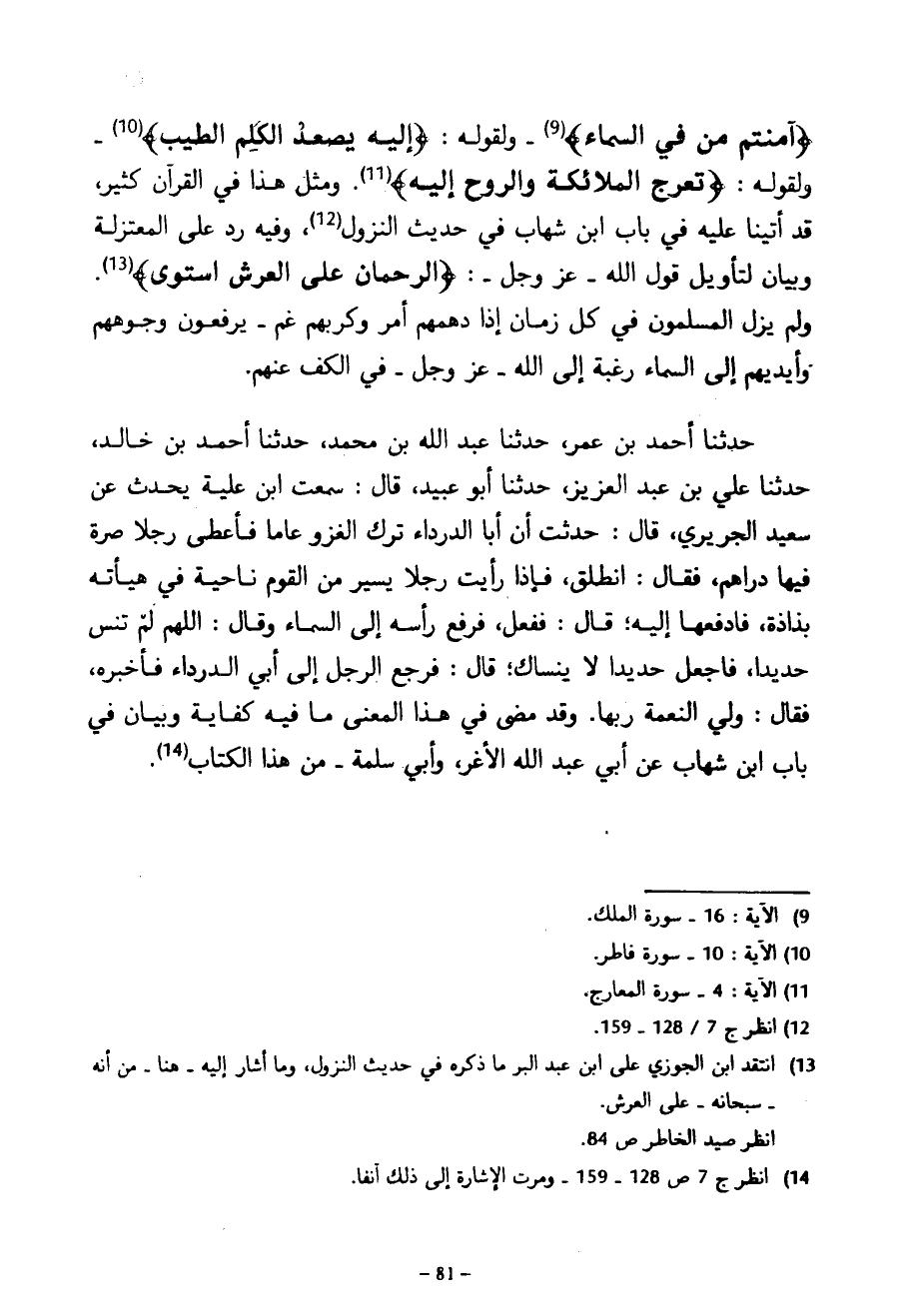 آمنتم مَنْ فِي السَّمَاءِ وَلِقَوْلِهِ إِلَيْهِ يَصْعَدُ الْكَلِمُ الطَّيِّبُ وَلِقَوْلِهِ تَعْرُجُ الْمَلَائِكَةُ وَالرُّوحُ إِلَيْهِ وَمِثْلُ هَذَا فِي الْقُرْآنِ كَثِيرٌ قَدْ أَتَيْنَا عَلَيْهِ فِي بَابِ ابْنِ شِهَابٍ فِي حَدِيثِ النُّزُولِ وَفِيهِ رَدٌّ عَلَى الْمُعْتَزِلَةِ وَبَيَانٌ لِتَأْوِيلِ قَوْلِ الله عز وجل الرحمان عَلَى الْعَرْشِ اسْتَوَى وَلَمْ يَزَلِ الْمُسْلِمُونَ فِي كُلِّ زَمَانٍ إِذَا دَهَمَهُمْ أَمْرٌ وَكَرَبَهُمْ غَمٌّ يَرْفَعُونَ وُجُوهَهُمْ وَأَيْدِيَهُمْ إِلَى السَّمَاءِ رَغْبَةً إِلَى اللَّهِ عَزَّ وَجَلَّ فِي الْكَفِّ عَنْهُمْ حَدَّثَنَا أَحْمَدُ بْنُ عُمَرَ حَدَّثَنَا عَبْدُ اللَّهِ بْنُ مُحَمَّدٍ حَدَّثَنَا أَحْمَدُ بْنُ خَالِدٍ حَدَّثَنَا عَلِيُّ بْنُ عَبْدِ الْعَزِيزِ حَدَّثَنَا أَبُو عُبَيْدٍ قَالَ سَمِعْتُ ابْنَ عُلَيَّةَ يُحَدِّثُ عَنْ سَعِيدٍ الْجُرَيْرِيِّ قَالَ حُدِّثْتُ أَنَّ أَبَا الدَّرْدَاءِ تَرَكَ الْغَزْوَ عَامًا فَأَعْطَى رَجُلًا صُرَّةً فِيهَا دَرَاهِمُ فَقَالَ انْطَلِقْ فَإِذَا رَأَيْتَ رَجُلًا يَسِيرُ مِنَ الْقَوْمِ ناحية في هيأته بَذَاذَةٌ فَادْفَعْهَا إِلَيْهِ قَالَ فَفَعَلَ فَرَفَعَ رَأَسَهُ إِلَى السَّمَاءِ وَقَالَ اللَّهُمَّ لَمْ تَنْسَ حَدِيدًا فَاجْعَلْ حَدِيدًا لَا يَنْسَاكَ قَالَ فَرَجَعَ الرَّجُلُ إِلَى أَبِي الدَّرْدَاءِ فَأَخْبَرَهُ فَقَالَ وَلِيُّ النِّعْمَةِ رَبُّهَا وَقَدْ مَضَى فِي هَذَا الْمَعْنَى مَا فِيهِ كِفَايَةٌ وَبَيَانٌ فِي بَابِ ابْنِ شِهَابٍ عَنْ أَبِي عَبْدِ اللَّهِ الْأَغَرِّ وَأَبِي سَلَمَةَ مِنْ هَذَا الْكِتَابِ