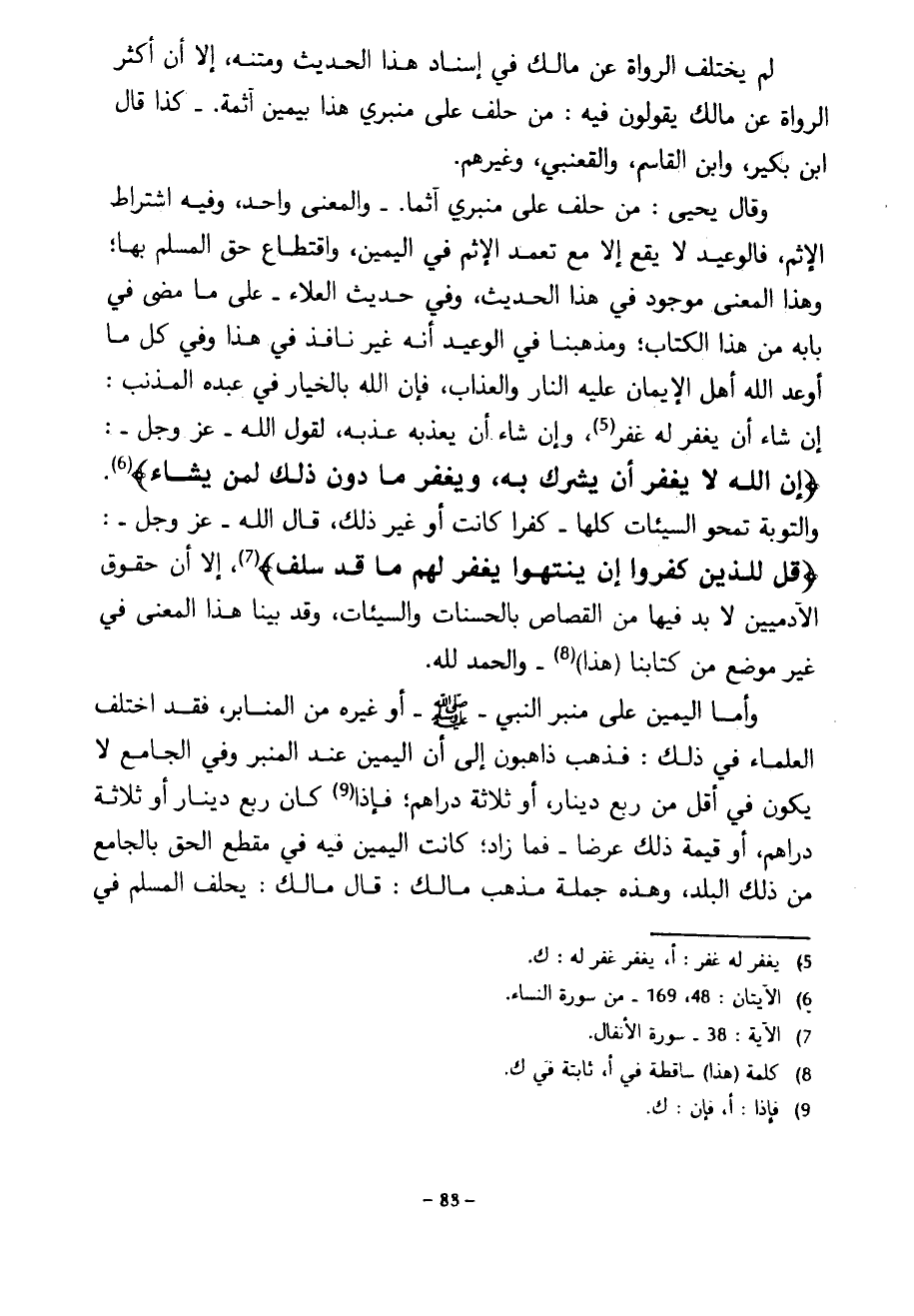 لَمْ يَخْتَلِفِ الرُّوَاةُ عَنْ مَالِكٍ فِي إِسْنَادِ هَذَا الْحَدِيثِ وَمَتْنِهِ إِلَّا أَنَّ أَكْثَرَ الرُّوَاةِ عَنْ مَالِكٍ يَقُولُونَ فِيهِ مَنْ حَلَفَ عَلَى مِنْبَرِي هَذَا بِيَمِينٍ آثِمَةٍ كَذَا قَالَ ابْنُ بُكَيْرٍ وَابْنُ الْقَاسِمِ وَالْقَعْنَبِيُّ وَغَيْرُهُمْ وَقَالَ يَحْيَى مَنْ حَلَفَ عَلَى مِنْبَرِي آثِمًا وَالْمَعْنَى وَاحِدٌ وَفِيهِ اشْتِرَاطُ الْإِثْمِ فَالْوَعِيدُ لَا يَقَعُ إِلَّا مَعَ تَعَمُّدِ الْإِثْمِ فِي الْيَمِينِ وَاقْتِطَاعِ حَقِّ الْمُسْلِمِ بِهَا وَهَذَا الْمَعْنَى مَوْجُودٌ فِي هَذَا الْحَدِيثِ وَفِي حَدِيثِ الْعَلَاءِ عَلَى مَا مَضَى فِي بَابِهِ مِنْ هَذَا الْكِتَابِ وَمَذْهَبُنَا فِي الْوَعِيدِ أَنَّهُ غَيْرُ نَافِذٍ فِي هَذَا وَفِي كُلِّ مَا أَوْعَدَ اللَّهُ أَهْلَ الْإِيمَانِ عَلَيْهِ النَّارَ وَالْعَذَابَ فَإِنَّ اللَّهَ بِالْخِيَارِ فِي عَبْدِهِ الْمُذْنِبِ إِنْ شَاءَ أَنْ يَغْفِرَ لَهُ غَفَرَ وَإِنْ شَاءَ أَنْ يُعَذِّبَهُ عَذَّبَهُ لِقَوْلِ اللَّهِ عَزَّ وَجَلَّ إِنَّ اللَّهَ لَا يَغْفِرُ أَنْ يُشْرَكَ بِهِ وَيَغْفِرَ مَا دُونَ ذَلِكَ لِمَنْ يشاء والتوبة تمحو السيآت كُلَّهَا كُفْرًا كَانَتْ أَوْ غَيْرَ ذَلِكَ قَالَ اللَّهُ عَزَّ وَجَلَّ قُلْ لِلَّذِينَ كَفَرُوا إِنْ يَنْتَهُوا يُغْفَرْ لَهُمْ مَا قَدْ سَلَفَ إِلَّا أَنَّ حُقُوقَ الْآدَمِيِّينَ لَا بُدَّ فِيهَا مِنَ الْقِصَاصِ بِالْحَسَنَاتِ وَالسَّيِّئَاتِ وَقَدْ بَيَّنَّا هَذَا الْمَعْنَى فِي غَيْرِ مَوْضِعٍ مِنْ كِتَابِنَا (هَذَا) وَالْحَمْدُ لِلَّهِ وَأَمَّا الْيَمِينُ عَلَى مِنْبَرِ النَّبِيِّ صَلَّى اللَّهُ عَلَيْهِ وَسَلَّمَ أَوْ غَيْرِهِ مِنَ الْمَنَابِرِ فَقَدِ اخْتَلَفَ الْعُلَمَاءُ فِي ذَلِكَ فَذَهَبَ ذَاهِبُونَ إِلَى أَنَّ الْيَمِينَ عِنْدَ الْمِنْبَرِ وَفِي الْجَامِعِ لَا يَكُونُ فِي أَقَلِّ مِنْ رُبْعِ دِينَارٍ أَوْ ثَلَاثَةِ دَرَاهِمَ فَإِذَا كَانَ رُبْعَ دِينَارٍ أَوْ ثَلَاثَةَ دَرَاهِمَ أَوْ قِيمَةَ ذَلِكَ عَرْضًا فَمَا زَادَ كَانَتِ الْيَمِينُ فِيهِ فِي مَقْطَعِ الْحَقِّ بِالْجَامِعِ مِنْ ذَلِكَ الْبَلَدِ وَهَذِهِ جُمْلَةُ مَذْهَبِ مَالِكٍ قَالَ مَالِكٌ يَحْلِفُ الْمُسْلِمُ فِي