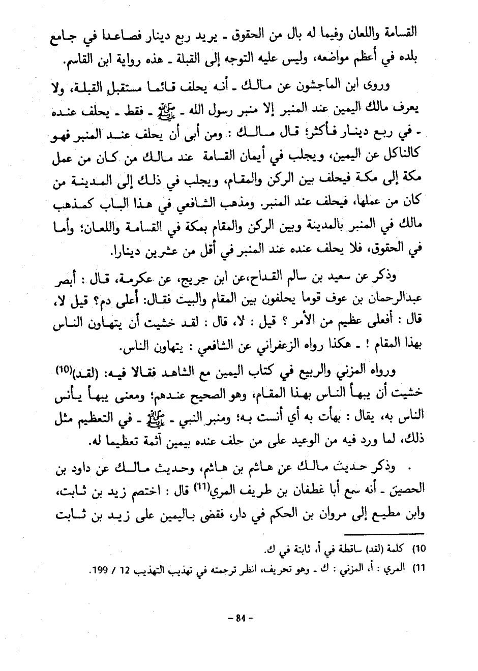 الْقَسَامَةِ وَاللِّعَانِ وَفِيمَا لَهُ بَالٌ مِنَ الْحُقُوقِ يُرِيدُ رُبْعَ دِينَارٍ فَصَاعِدًا فِي جَامِعِ بَلَدِهِ فِي أَعْظَمِ مَوَاضِعِهِ وَلَيْسَ عَلَيْهِ التَّوَجُّهُ إِلَى الْقِبْلَةِ هَذِهِ رِوَايَةُ ابْنِ الْقَاسِمِ وَرَوَى ابْنُ الْمَاجِشُونِ عَنْ مَالِكٍ أَنَّهُ يَحْلِفُ قَائِمًا مُسْتَقْبِلَ الْقِبْلَةِ وَلَا يَعْرِفُ مَالِكٌ الْيَمِينَ عِنْدَ الْمِنْبَرِ إِلَّا مِنْبَرَ رَسُولِ اللَّهِ صَلَّى اللَّهُ عَلَيْهِ وَسَلَّمَ فَقَطْ يَحْلِفُ عِنْدَهُ فِي رُبْعِ دِينَارٍ فَأَكْثَرَ قَالَ مَالِكٌ وَمَنْ أَبَى أَنْ يَحْلِفَ عِنْدَ الْمِنْبَرِ فَهُوَ كَالنَّاكِلِ عَنِ الْيَمِينِ وَيُجْلَبُ فِي أَيْمَانِ الْقَسَامَةِ عِنْدَ مَالِكٍ مَنْ كَانَ مِنْ عَمَلِ مَكَّةَ إِلَى مَكَّةَ فَيَحْلِفُ بَيْنَ الرُّكْنِ وَالْمَقَامِ وَيُجْلَبُ فِي ذَلِكَ إِلَى الْمَدِينَةِ مَنْ كَانَ مِنْ عَمَلِهَا فَيَحْلِفُ عِنْدَ الْمِنْبَرِ وَمَذْهَبُ الشَّافِعِيِّ فِي هَذَا الْبَابِ كَمَذْهَبِ مَالِكٍ فِي الْمِنْبَرِ بِالْمَدِينَةِ وَبَيْنَ الرُّكْنِ وَالْمَقَامِ بِمَكَّةَ فِي الْقَسَامَةِ وَاللِّعَانِ وَأَمَّا فِي الْحُقُوقِ فَلَا يَحْلِفُ عِنْدَهُ عِنْدَ الْمِنْبَرِ فِي أَقَلِّ مِنْ عِشْرِينَ دِينَارًا وَذُكِرَ عَنْ سَعِيدِ بْنِ سَالِمٍ الْقَدَّاحِ عَنِ ابْنِ جُرَيْجٍ عَنْ عِكْرِمَةَ قَالَ أبصر عبد الرحمان بْنُ عَوْفٍ قَوْمًا يَحْلِفُونَ بَيْنَ الْمَقَامِ وَالْبَيْتِ فَقَالَ أَعَلَيَّ دَمٌ قِيلَ لَا قَالَ أَفَعَلَيَّ عَظِيمٌ مِنَ الْأَمْرِ قِيلَ لَا قَالَ لَقَدْ خَشِيتُ أَنْ يَتَهَاوَنَ النَّاسُ بِهَذَا الْمَقَامِ هَكَذَا رَوَاهُ الزَّعْفَرَانِيُّ عَنِ الشَّافِعِيِّ يَتَهَاوَنُ النَّاسُ وَرَوَاهُ الْمُزَنِيُّ وَالرَّبِيعُ فِي كِتَابِ الْيَمِينِ مَعَ الشَّاهِدِ فَقَالَا فِيهِ (لَقَدْ) خَشِيتُ أَنْ يَبْهَأَ النَّاسُ بِهَذَا الْمَقَامِ وَهُوَ الصَّحِيحُ عِنْدَهُمْ وَمَعْنَى يَبْهَأُ يَأْنَسُ النَّاسُ بِهِ يُقَالُ بَهَأْتُ بِهِ أَيْ أَنِسْتُ بِهِ وَمِنْبَرُ النَّبِيِّ صَلَّى اللَّهُ عَلَيْهِ وَسَلَّمَ فِي التَّعْظِيمِ مِثْلُ ذَلِكَ لِمَا وَرَدَ فِيهِ مِنَ الْوَعِيدِ عَلَى مَنْ حَلَفَ عِنْدَهُ بِيَمِينٍ آثِمَةٍ تَعْظِيمًا لَهُ وَذُكِرَ حَدِيثُ مَالِكٍ عَنْ هَاشِمِ بْنِ هَاشِمٍ وَحَدِيثُ مَالِكٌ عَنْ دَاوُدَ بْنِ الْحُصَيْنِ أَنَّهُ سَمِعَ أَبَا غَطَفَانَ بْنَ طَرِيفٍ الْمُرِّيَّ قَالَ اخْتَصَمَ زَيْدُ بْنُ ثابت وابن مطيع إلى مروا بْنِ الْحَكَمِ فِي دَارٍ فَقَضَى بِالْيَمِينِ عَلَى زَيْدِ بْنِ ثَابِتٍ