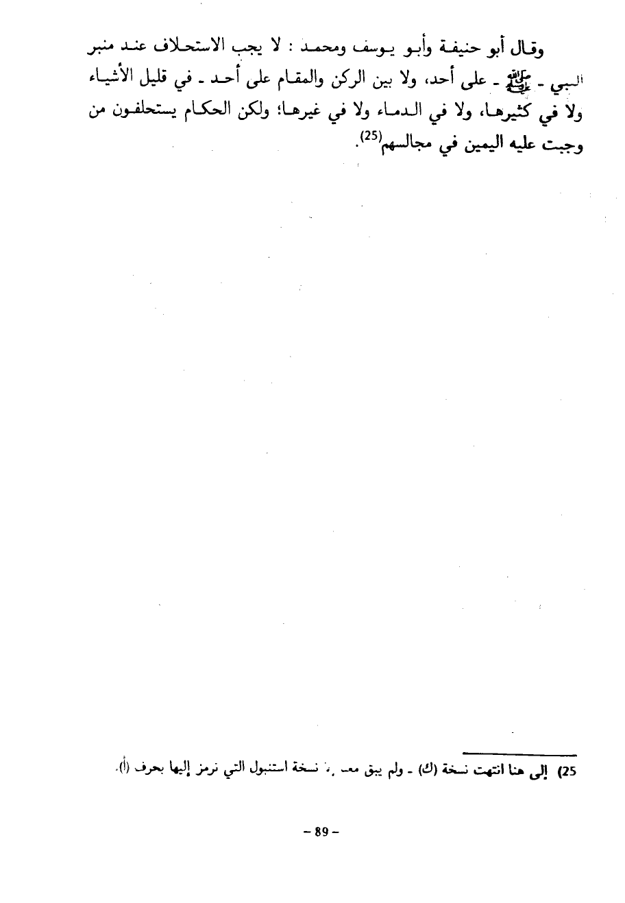 وَقَالَ أَبُو حَنِيفَةَ وَأَبُو يُوسُفَ وَمُحَمَّدٌ لَا يَجِبُ الِاسْتِحْلَافُ عِنْدَ مِنْبَرِ النَّبِيِّ صَلَّى اللَّهُ عَلَيْهِ وَسَلَّمَ عَلَى أَحَدٍ وَلَا بَيْنَ الرُّكْنِ وَالْمَقَامِ عَلَى أَحَدٍ فِي قَلِيلِ الْأَشْيَاءِ وَلَا فِي كَثِيرِهَا وَلَا فِي الدِّمَاءِ وَلَا فِي غَيْرِهَا وَلَكِنَّ الْحُكَّامَ يَسْتَحْلِفُونَ مَنْ وَجَبَتْ عَلَيْهِ الْيَمِينُ فِي مَجَالِسِهِمْ