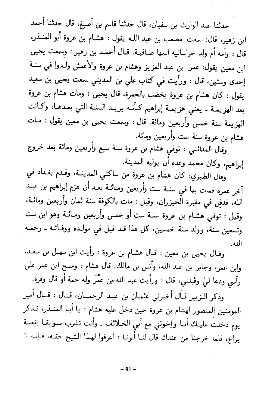 حَدَّثَنَا عَبْدُ الْوَارِثِ بْنُ سُفْيَانَ قَالَ حَدَّثَنَا قاسم بن أصبغ قال حدثنا أحمد ابن زُهَيْرٍ قَالَ سَمِعْتُ مُصْعَبَ بْنَ عَبْدِ اللَّهِ يَقُولُ هِشَامُ بْنُ عُرْوَةَ أَبُو الْمُنْذِرِ قَالَ وَأُمُّهُ أَمُّ وَلَدٍ خُرَاسَانِيَّةٌ اسْمُهَا صَافِيَةُ قَالَ أحمد بن زهير وسمعت يحيى ابن مَعِينٍ يَقُولُ عُمَرُ بْنُ عَبْدِ الْعَزِيزِ وَهُشَامُ بْنُ عُرْوَةَ وَالْأَعْمَشُ وُلِدُوا فِي سَنَةِ إِحْدَى وَسِتِّينَ قَالَ وَرَأَيْتُ فِي كِتَابِ عَلِيُّ بْنُ الْمَدِينِيِّ سَمِعْتُ يَحْيَى بْنَ سَعِيدٍ يَقُولُ كَانَ هِشَامُ بْنُ عُرْوَةَ يُخَضِّبُ بِالْحُمْرَةِ قَالَ يَحْيَى وَمَاتَ هِشَامُ بْنُ عُرْوَةَ بَعْدَ الْهَزِيمَةِ يَعْنِي هَزِيمَةَ إِبْرَاهِيمَ كَأَنَّهُ يُرِيدُ السَّنَةَ الَّتِي بَعْدَهَا وَكَانَتِ الْهَزِيمَةُ سَنَةَ خَمْسٍ وَأَرْبَعِينَ وَمِائَةٍ قَالَ وَسَمِعْتُ يَحْيَى بْنَ مَعِينٍ يَقُولُ مَاتَ هِشَامُ بْنُ عُرْوَةَ سَنَةَ سِتٍّ وَأَرْبَعِينَ وَمِائَةٍ وَقَالَ الْمَدَائِنِيُّ تُوُفِّيَ هِشَامُ بْنُ عُرْوَةَ سَنَةَ سَبْعٍ وَأَرْبَعِينَ وَمِائَةٍ بَعْدَ خُرُوجِ إِبْرَاهِيمَ وَكَانَ مُحَمَّدٌ وَعَدَهُ أَنْ يُوَلِّيَهُ الْمَدِينَةَ وَقَالَ الطَّبَرِيُّ كَانَ هِشَامُ بْنُ عُرْوَةَ مِنْ سَاكِنِي الْمَدِينَةِ وَقَدِمَ بَغْدَادَ فِي آخِرِ عُمْرِهِ فَمَاتَ بِهَا فِي سَنَةِ سِتٍّ وَأَرْبَعِينَ وَمِائَةٍ بَعْدَ أَنْ هُزِمَ إِبْرَاهِيمُ بْنُ عَبْدِ اللَّهِ فَدُفِنَ فِي مَقْبَرَةِ الْخَيْزُرَانِ وَقِيلَ مَاتَ بِالْكُوفَةِ سَنَةَ ثَمَانٍ وَأَرْبَعِينَ وَمِائَةٍ وَقِيلَ تُوُفِّيَ هِشَامُ بْنُ عُرْوَةَ سَنَةَ سِتٍّ أَوْ خَمْسٍ وَأَرْبَعِينَ وَمِائَةٍ وَهُوَ ابْنُ سِتٍّ وَتِسْعِينَ سَنَةً وَوُلِدَ سَنَةَ خَمْسِينَ كُلُّ هَذَا قَدْ قِيلَ فِي مَوْلِدِهِ وَوَفَاتِهِ رَحِمَهُ اللَّهُ وَقَالَ يَحْيَى بْنُ مَعِينٍ قَالَ هِشَامُ بْنُ عُرْوَةَ رَأَيْتُ ابْنَ سَهْلِ بْنِ سَعْدٍ وَابْنَ عُمَرَ وَجَابِرَ بْنَ عَبْدِ اللَّهِ وَأَنَسَ بْنَ مَالِكٍ قَالَ هِشَامٌ وَمَسَحَ ابْنُ عُمَرَ عَلَى رَأْسِي وَدَعَا لِي وَقَبَّلَنِي قَالَ وَرَأَيْتُ عَبْدَ اللَّهِ بْنَ عُمَرَ وَلَهُ جُمَّةٌ أَوْ قَالَ وَفْرَةٌ وَذَكَرَ الزُّبَيْرُ قَالَ أَخْبَرَنِي عُثْمَانُ بن عبد الرحمان قَالَ قَالَ أَمِيرُ الْمُؤْمِنِينَ الْمَنْصُورُ لِهِشَامِ بْنِ عُرْوَةَ حِينَ دَخَلَ عَلَيْهِ هِشَامٌ يَا أَبَا الْمُنْذِرِ تَذْكُرُ يَوْمَ دَخَلْتُ عَلَيْكَ أَنَا وَإِخْوَتِي مَعَ أَبِي الْخَلَائِفِ وَأَنْتَ تَشْرَبُ سَوِيقًا بِقُعْبَةِ يَرَاعٍ فَلَمَّا خَرَجْنَا مِنْ عِنْدِكَ قَالَ لَنَا أَبُونَا اعْرِفُوا لِهَذَا الشَّيْخِ حَقَّهُ فَإِنَّهُ لَا