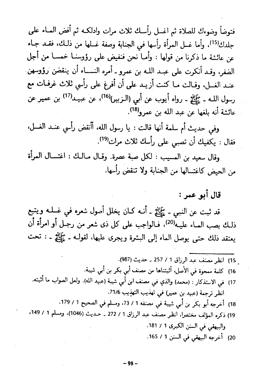 فَتَوَضَّأْ وُضُوءَكَ لِلصَّلَاةِ ثُمَّ اغْسِلْ رَأْسَكَ ثَلَاثَ مَرَّاتٍ وَادْلُكْهُ ثُمَّ أَفِضِ الْمَاءَ عَلَى جِلْدِكَ وَأَمَّا غُسْلُ الْمَرْأَةِ رَأْسَهَا فِي الْجَنَابَةِ وَصِفَةُ غُسْلِهَا مِنْ ذَلِكَ فَقَدْ جَاءَ عَنْ عَائِشَةَ مَا ذَكَرْنَا مِنْ قَوْلِهَا وَأَمَّا نَحْنُ فَنُفِيضُ على رؤوسنا خَمْسًا مِنْ أَجْلِ الضَّفْرِ وَقَدْ أَنْكَرَتْ عَلَى عَبْدِ اللَّهِ بْنِ عَمْرٍو أَمْرَهُ النِّسَاءَ أَنْ ينقضن رؤوسهن عِنْدَ الْغُسْلِ وَقَالَتْ مَا كُنْتُ أَزِيدُ عَلَى أَنْ أَفْرَغَ عَلَى رَأْسِي ثَلَاثَ غُرُفَاتٍ مَعَ رَسُولِ اللَّهِ صَلَّى اللَّهُ عَلَيْهِ وَسَلَّمَ رَوَاهُ أَيُّوبُ عَنْ أَبِي (الزُّبَيْرِ) عَنْ عُبَيْدِ بْنِ عُمَيْرٍ عَنْ عَائِشَةَ أَنَّهُ بَلَغَهَا عَنْ عَبْدِ اللَّهِ بْنِ عَمْرٍو وَفِي حَدِيثِ أُمِّ سَلَمَةَ أَنَّهَا قَالَتْ يَا رَسُولَ اللَّهِ أَأَنْقُضُ رَأْسِي عِنْدَ الْغُسْلِ فَقَالَ يَكْفِيكِ أَنْ تَصُبِّي عَلَى رَأْسِكِ ثَلَاثَ مَرَّاتٍ وَقَالَ سَعِيدُ بْنُ الْمُسَيَّبِ لِكُلِّ صَبَّةٍ عَصْرَةٌ وَقَالَ مَالِكٌ اغْتِسَالُ الْمَرْأَةِ مِنَ الْحَيْضِ كَاغْتِسَالِهَا مِنَ الْجَنَابَةِ وَلَا تَنْقُضُ رَأْسَهَا قَالَ أَبُو عُمَرَ قَدْ ثَبَتَ عَنِ النَّبِيِّ صَلَّى اللَّهُ عَلَيْهِ وَسَلَّمَ أَنَّهُ كَانَ يُخَلِّلُ أُصُولَ شَعْرِهِ فِي غُسْلِهِ وَيُتْبِعُ ذَلِكَ بِصَبِّ الْمَاءِ عَلَيْهِ فَالْوَاجِبُ عَلَى كُلِّ ذِي شَعْرٍ مِنْ رَجُلٍ أَوِ امْرَأَةٍ أَنْ يَعْتَقِدَ ذَلِكَ حَتَّى يُوَصِّلَ الْمَاءَ إِلَى الْبَشَرَةِ وَيَجْرِيَ عَلَيْهَا لِقَوْلِهِ صَلَّى اللَّهُ عَلَيْهِ وَسَلَّمَ تَحْتَ