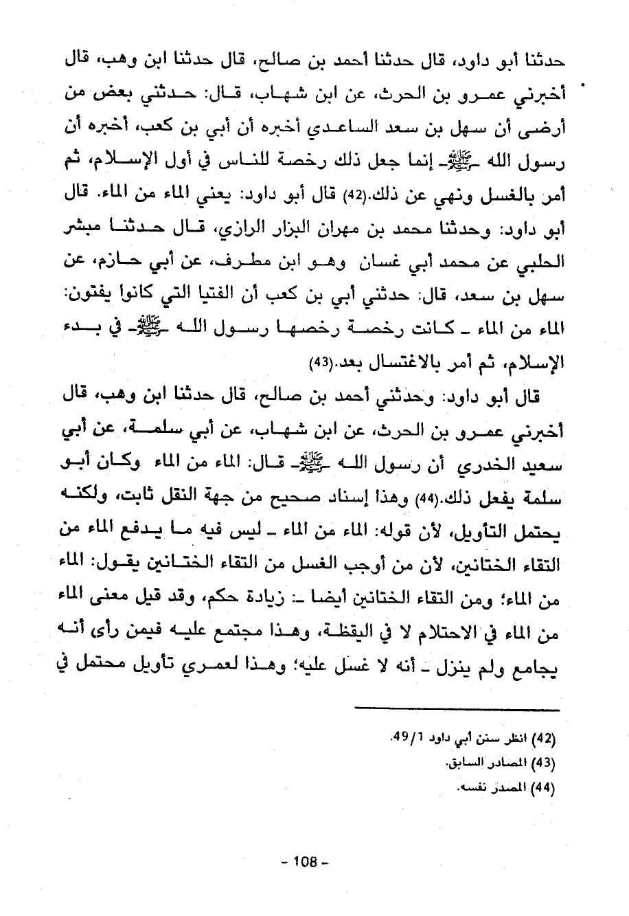 حَدَّثَنَا أَبُو دَاوُدَ قَالَ حَدَّثَنَا أَحْمَدُ بْنُ صَالِحٍ قَالَ حَدَّثَنَا ابْنُ وَهْبٍ قَالَ أَخْبَرَنِي عمرو بن الحرث عَنِ ابْنِ شِهَابٍ قَالَ حَدَّثَنِي بَعْضُ مَنْ أَرْضَى أَنَّ سَهْلَ بْنَ سَعْدٍ السَّاعِدِيَّ أَخْبَرَهُ أَنَّ أُبَيَّ بْنَ كَعْبٍ أَخْبَرَهُ أَنَّ رَسُولَ الله إِنَّمَا جَعَلَ ذَلِكَ رُخْصَةً لِلنَّاسِ فِي أَوَّلِ الْإِسْلَامِ ثُمَّ أَمَرَ بِالْغُسْلِ وَنَهَى عَنْ ذَلِكَ