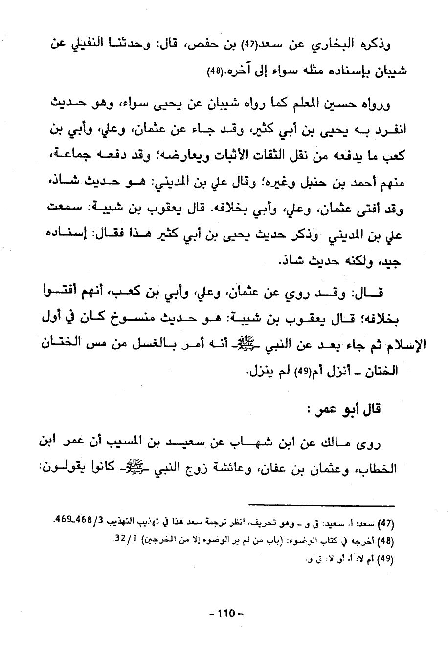 وَرَوَاهُ حُسَيْنٌ الْمُعَلِّمُ كَمَا رَوَاهُ شَيْبَانُ عَنْ يَحْيَى سَوَاءً وَهُوَ حَدِيثٌ انْفَرَدَ بِهِ يَحْيَى بْنُ أَبِي كَثِيرٍ وَقَدْ جَاءَ عَنْ عُثْمَانَ وَعَلِيٍّ وَأُبَيِّ بْنِ كَعْبٍ مَا يَدْفَعُهُ مِنْ نَقْلِ الثِّقَاتِ الْأَثْبَاتِ وَيُعَارِضُهُ وَقَدْ دَفَعَهُ جَمَاعَةٌ مِنْهُمْ أَحْمَدُ بْنُ حَنْبَلٍ وَغَيْرُهُ وَقَالَ عَلِيٌّ وَأُبَيٌّ بِخِلَافِهِ