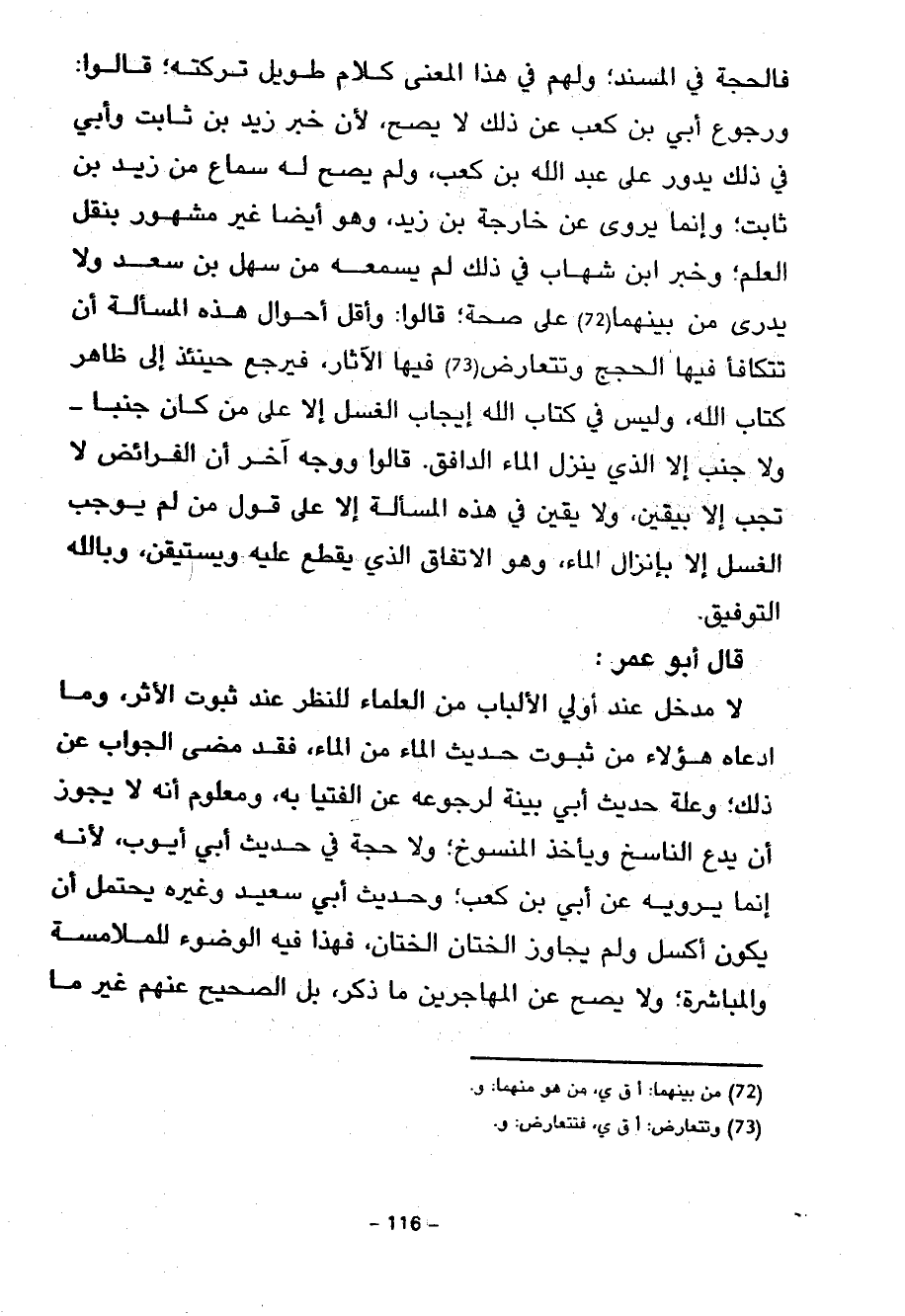 قَالَ أَبُو عُمَرَ لَا مَدْخَلَ عِنْدَ أُولِي الْأَلْبَابِ مِنَ الْعُلَمَاءِ لِلنَّظَرِ عِنْدَ ثُبُوتِ الْأَثَرِ وَمَا ادَّعَاهُ هَؤُلَاءِ مِنْ ثُبُوتِ حَدِيثِ الْمَاءُ مِنَ الْمَاءِ فَقَدْ مَضَى الْجَوَابُ عَنْ ذَلِكَ وَعِلَّةُ حَدِيثِ أُبَيٍّ بَيِّنَةٌ لِرُجُوعِهِ عَنِ الْفُتْيَا بِهِ وَمَعْلُومٌ أَنَّهُ لَا يَجُوزُ أَنْ يَدَعَ النَّاسِخَ وَيَأْخُذَ الْمَنْسُوخَ وَلَا حُجَّةَ فِي حَدِيثِ أَبِي أيوب لأنه إنما يرويه عن أبي كَعْبٍ وَحَدِيثُ أَبِي سَعِيدٍ وَغَيْرِهِ يُحْتَمَلُ أَنْ يَكُونَ أَكْسَلَ وَلَمْ يُجَاوِزِ الْخِتَانُ الْخِتَانَ فَهَذَا فِيهِ الْوُضُوءُ لِلْمُلَامَسَةِ وَالْمُبَاشَرَةِ وَلَا يَصِحُّ عَنِ المهاجرين ما ذكر بل الصحيح عنهم غير ما
