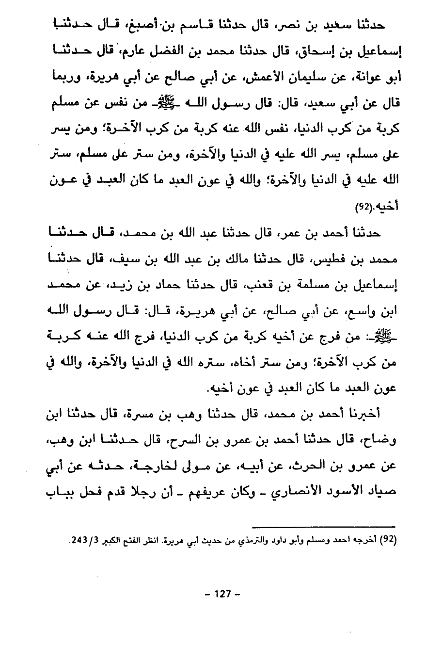 حَدَّثَنَا سَعِيدُ بْنُ نَصْرٍ قَالَ حَدَّثَنَا قَاسِمُ بْنُ أَصْبَغَ قَالَ حَدَّثَنَا إِسْمَاعِيلُ بْنُ إِسْحَاقَ قَالَ حَدَّثَنَا مُحَمَّدُ بْنُ الْفَضْلِ عَارِمٌ قَالَ حَدَّثَنَا أَبُو عَوَانَةَ عَنْ سُلَيْمَانَ الْأَعْمَشِ عَنْ أَبِي صَالِحٍ عَنْ أَبِي هُرَيْرَةَ وَرُبَّمَا قَالَ عَنْ أَبِي سَعِيدٍ قَالَ قَالَ رَسُولُ اللَّهِ صَلَّى اللَّهُ عَلَيْهِ وَسَلَّمَ مَنْ نَفَّسَ عَنْ مُسْلِمٍ كُرْبَةً مِنْ كُرَبِ الدُّنْيَا نَفَّسَ اللَّهُ عَنْهُ كُرْبَةً مِنْ كُرَبِ الْآخِرَةِ وَمِنْ يَسَّرَ عَلَى مُسْلِمٍ يَسَّرَ اللَّهُ عَلَيْهِ فِي الدُّنْيَا وَالْآخِرَةِ وَمَنْ سَتَرَ عَلَى مُسْلِمٍ سَتَرَ اللَّهُ عَلَيْهِ فِي الدُّنْيَا وَالْآخِرَةِ وَاللَّهُ فِي عَوْنِ الْعَبْدِ مَا كَانَ الْعَبْدُ فِي عَوْنِ أَخِيهِ
