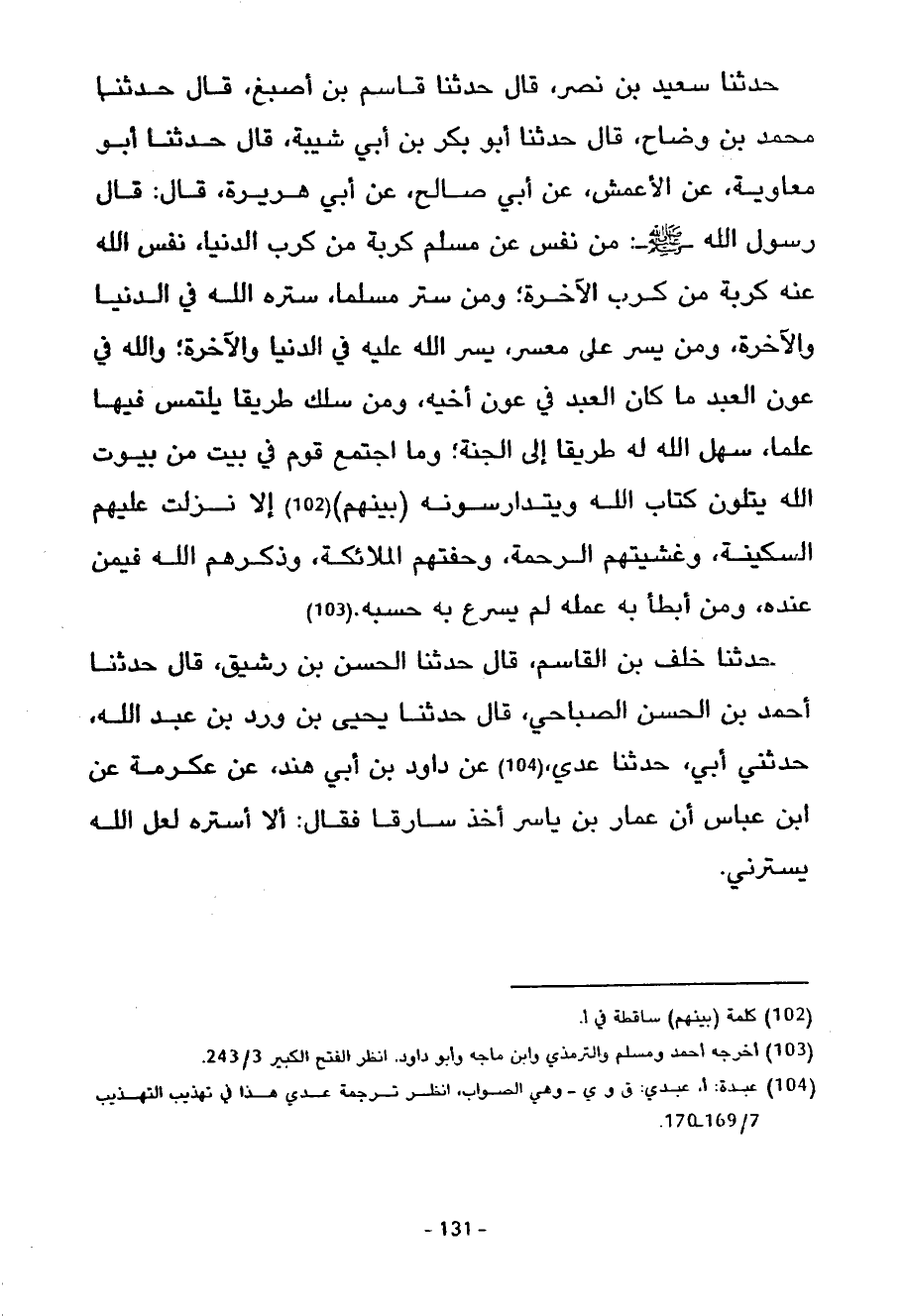 حَدَّثَنَا سَعِيدُ بْنُ نَصْرٍ قَالَ حَدَّثَنَا قَاسِمُ بْنُ أَصْبَغَ قَالَ حَدَّثَنَا مُحَمَّدُ بْنُ وَضَّاحٍ قَالَ حَدَّثَنَا أَبُو بَكْرِ بْنُ أَبِي شَيْبَةَ قَالَ حَدَّثَنَا أَبُو مُعَاوِيَةَ عَنِ الْأَعْمَشِ عَنْ أَبِي صَالِحٍ عَنْ أَبِي هُرَيْرَةَ قَالَ قَالَ رَسُولُ اللَّهِ صلى الله عليه وسلم من نَفَّسَ عَنْ مُسْلِمٍ كُرْبَةً مِنْ كُرَبِ الدُّنْيَا نَفَّسَ اللَّهُ عَنْهُ كُرْبَةً مِنْ كُرَبِ الْآخِرَةِ وَمَنْ سَتَرَ مُسْلِمًا سَتَرَهُ اللَّهُ فِي الدُّنْيَا وَالْآخِرَةِ وَمَنْ يَسَّرَ عَلَى مُعْسِرٍ يَسَّرَ اللَّهُ عَلَيْهِ فِي الدُّنْيَا وَالْآخِرَةِ وَاللَّهُ فِي عَوْنِ الْعَبْدِ مَا كَانَ الْعَبْدُ فِي عَوْنِ أَخِيهِ وَمَنْ سَلَكَ طَرِيقًا يَلْتَمِسُ فِيهَا عِلْمًا سَهَّلَ اللَّهُ لَهُ طَرِيقًا إِلَى الْجَنَّةِ وَمَا اجْتَمَعَ قوم في بيت من بيوت اللَّهِ يَتْلُونَ كِتَابَ اللَّهِ وَيَتَدَارَسُونَهُ بَيْنَهُمْ إِلَّا نَزَلَتْ عَلَيْهِمُ السَّكِينَةُ وَغَشِيَتْهُمُ الرَّحْمَةُ وَحَفَّتْهُمُ الْمَلَائِكَةُ وَذَكَرَهُمُ اللَّهُ فَيَمَنْ عِنْدَهُ وَمَنْ أَبْطَأَ بِهِ عَمَلُهُ لَمْ يُسْرِعْ بِهِ حَسَبُهُ