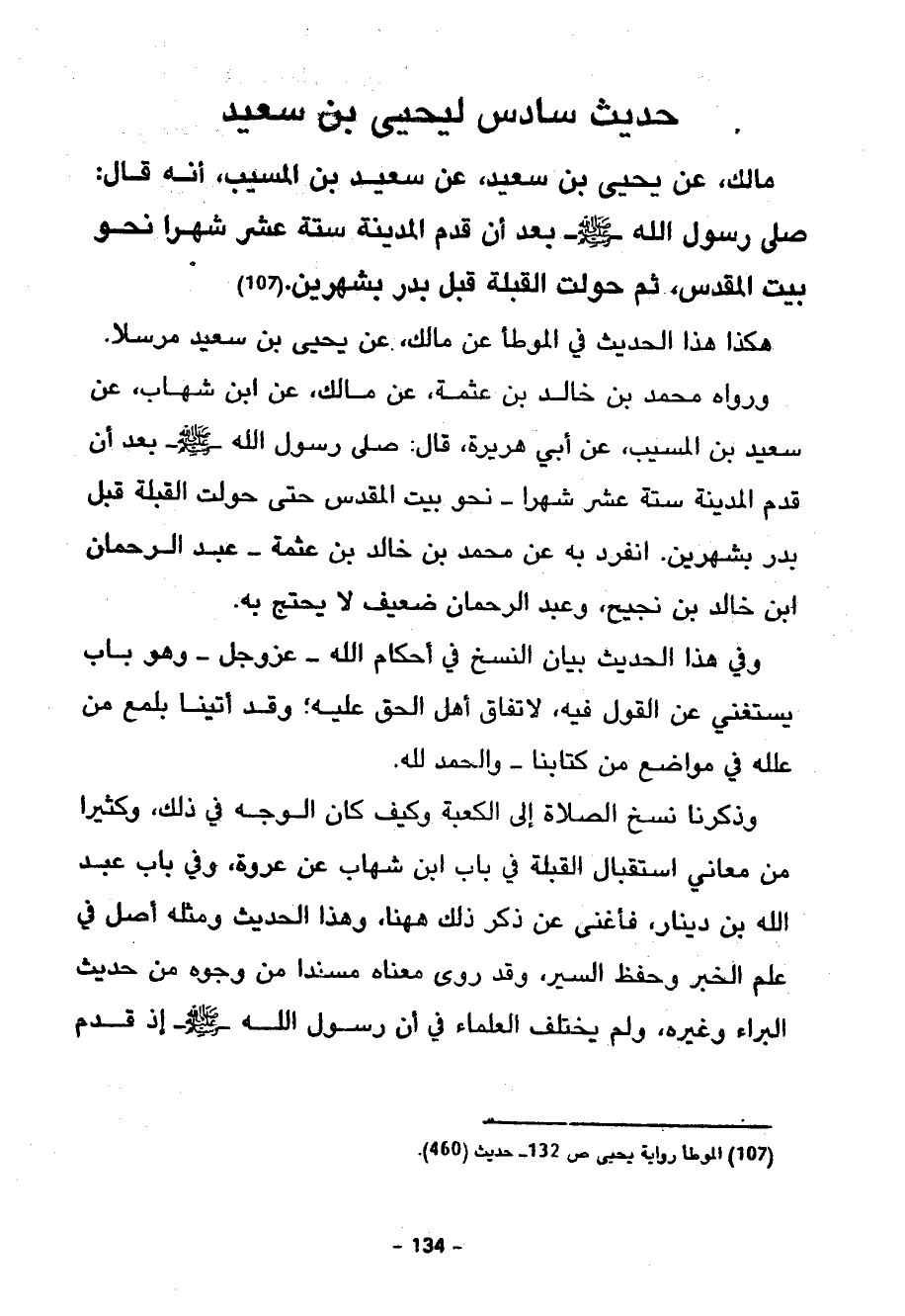 وَذَكَرْنَا نَسْخَ الصَّلَاةِ إِلَى الْكَعْبَةِ وَكَيْفَ كَانَ الْوَجْهُ فِي ذَلِكَ وَكَثِيرًا مِنْ مَعَانِي اسْتِقْبَالِ الْقِبْلَةِ فِي بَابِ ابْنِ شِهَابٍ عَنْ عُرْوَةَ وَفِي بَابِ عَبْدِ اللَّهِ بْنِ دِينَارٍ فَأَغْنَى عَنْ ذِكْرِ ذَلِكَ ههنا وَهَذَا الْحَدِيثُ وَمِثْلُهُ أَصْلٌ فِي عِلْمِ الْخَبَرِ وَحِفْظِ السِّيَرِ وَقَدْ رُوِيَ مَعْنَاهُ مُسْنَدًا مِنْ وُجُوهٍ مِنْ حَدِيثِ الْبَرَاءِ وَغَيْرِهِ وَلَمْ يَخْتَلِفِ الْعُلَمَاءُ فِي أَنَّ رَسُولَ اللَّهِ صَلَّى اللَّهُ عَلَيْهِ وَسَلَّمَ إِذَا قَدِمَ