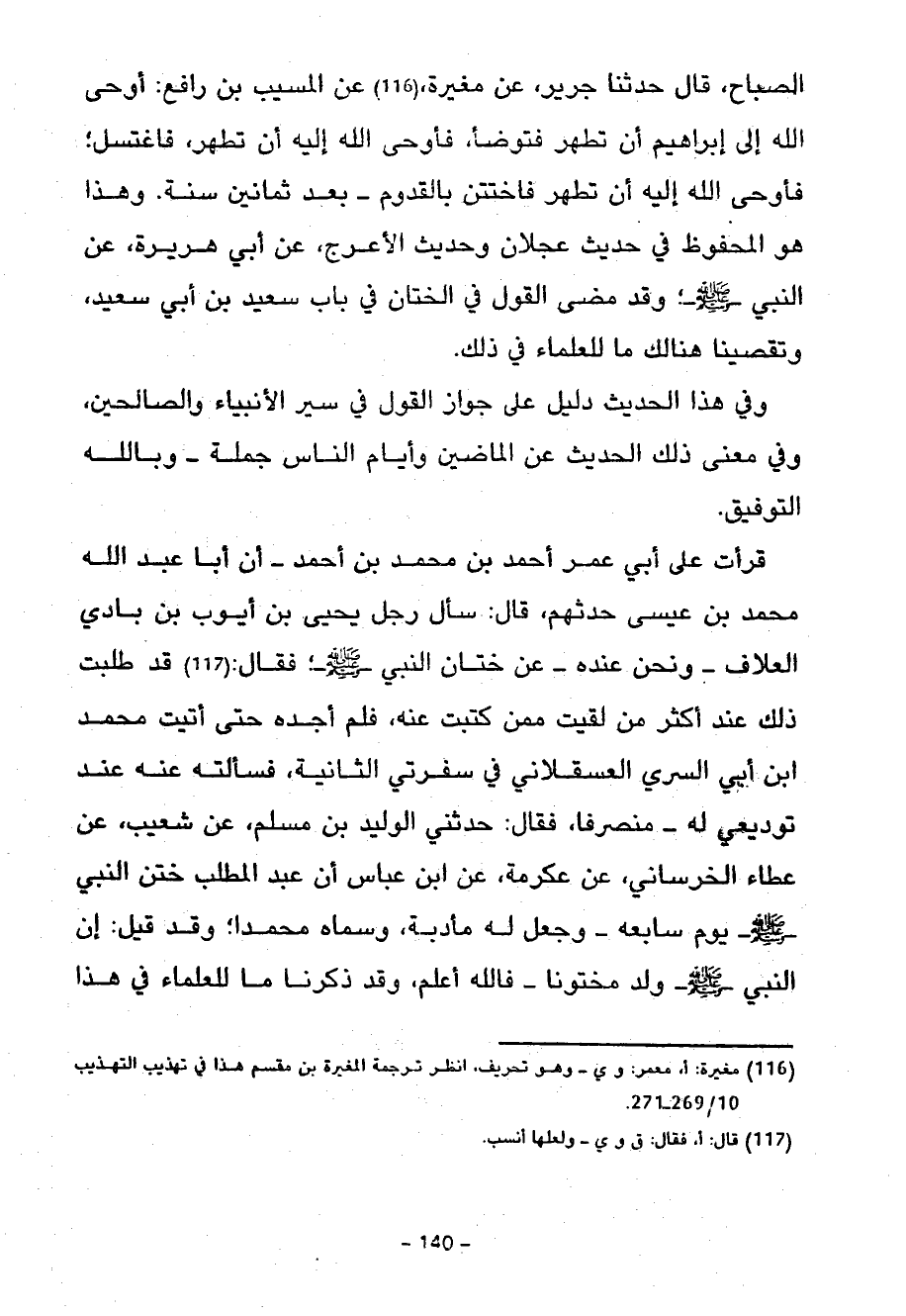 قَرَأْتُ عَلَى أَبِي عُمَرَ أَحْمَدَ بْنِ مُحَمَّدِ بْنِ أَحْمَدَ أَنَّ أَبَا عَبْدِ اللَّهِ مُحَمَّدَ بْنَ عِيسَى حَدَّثَهُمْ قَالَ سَأَلَ رَجُلٌ يَحْيَى بْنَ أَيُّوبَ بْنِ بَادِي الْعَلَّافَ وَنَحْنُ عِنْدَهُ عَنْ خِتَانِ النَّبِيُّ صَلَّى اللَّهُ عَلَيْهِ وَسَلَّمَ فَقَالَ قَدْ طَلَبْتُ ذَلِكَ عِنْدَ أَكْثَرِ مَنْ لَقِيتُ مِمَّنْ كَتَبْتُ عَنْهُ فَلَمْ أَجِدْهُ حَتَّى أَتَيْتُ مُحَمَّدَ ابن أَبِي السِّرِيِّ الْعَسْقَلَانِيَّ فِي سُفْرَتِي الثَّانِيَةِ فَسَأَلْتُهُ عَنْهُ عِنْدَ تَوْدِيعِي لَهُ مُنْصَرِفًا فَقَالَ حَدَّثَنِي الْوَلِيدُ بْنُ مُسْلِمٍ عَنْ شُعَيْبٍ عَنْ عَطَاءٍ الْخَرَسَانِيِّ عَنْ عِكْرِمَةَ عَنِ ابْنِ عَبَّاسٍ أَنَّ عَبْدَ الْمُطَّلِبِ خَتَنَ النَّبِيَّ صَلَّى اللَّهُ عَلَيْهِ وَسَلَّمَ يَوْمَ سَابِعِهِ وَجَعَلَ لَهُ مَأْدُبَةً وَسَمَّاهُ مُحَمَّدًا وَقَدْ قِيلَ إِنَّ النَّبِيَّ صَلَّى اللَّهُ عَلَيْهِ وَسَلَّمَ وُلِدَ مَخْتُونًا فَاللَّهُ أَعْلَمُ وَقَدْ ذَكَرْنَا مَا لِلْعُلَمَاءِ فِي هَذَا
