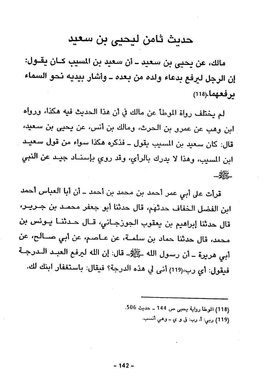 117 - مَالِكٌ عَنْ يَحْيَى بْنِ سَعِيدٍ أَنَّ سَعِيدَ بْنَ الْمُسَيَّبِ كَانَ يَقُولُ إِنَّ الرَّجُلَ لَيُرْفَعُ بِدُعَاءِ وَلَدِهِ مِنْ بَعْدِهِ وَأَشَارَ بِيَدَيْهِ نَحْوَ السَّمَاءِ يَرْفَعُهُمَا