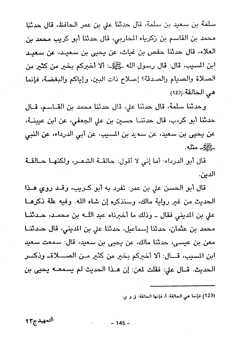 سَلَمَةُ بْنُ سَعِيدِ بْنِ سَلَمَةَ قَالَ حَدَّثَنَا عَلِيُّ بْنُ عُمَرَ الْحَافِظُ قَالَ حَدَّثَنَا مُحَمَّدُ بْنُ الْقَاسِمِ بْنِ زَكَرِيَّاءَ الْمُحَارِبِيُّ قَالَ حَدَّثَنَا أَبُو كُرَيْبٍ مُحَمَّدُ بْنُ الْعَلَاءِ قَالَ حَدَّثَنَا حَفْصُ بْنُ غِيَاثٍ عَنْ يَحْيَى بْنِ سعيد ابْنِ الْمُسَيَّبِ قَالَ قَالَ رَسُولُ اللَّهِ صَلَّى اللَّهُ عَلَيْهِ وَسَلَّمَ أَلَا أُخْبِرُكُمْ بِخَيْرٍ مِنْ كَثِيرٍ مِنَ الصَّلَاةِ وَالصِّيَامِ وَالصَّدَقَةِ إِصْلَاحُ ذَاتِ الْبَيْنِ وَإِيَّاكُمْ وَالْبِغْضَةَ فَإِنَّمَا هِيَ الْحَالِقَةُ