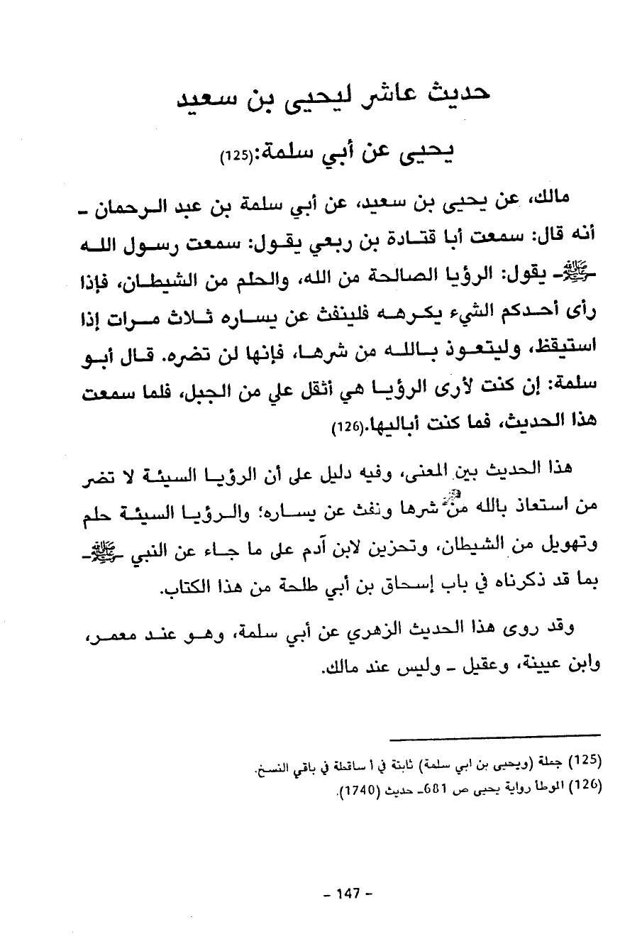 409 - مَالِكٌ عَنْ يَحْيَى بْنِ سَعِيدٍ عَنْ أَبِي سَلَمَةَ بْنِ عَبْدِ الرَّحْمَنِ أَنَّهُ قَالَ سَمِعْتُ أَبَا قَتَادَةَ بْنَ رِبْعِيٍّ يَقُولُ سَمِعْتُ رَسُولَ اللَّهِ صَلَّى اللَّهُ عَلَيْهِ وسلم يَقُولُ الرُّؤْيَا الصَّالِحَةُ مِنَ اللَّهِ وَالْحُلْمُ مِنَ الشَّيْطَانِ فَإِذَا رَأَى أَحَدُكُمُ الشَّيْءَ يَكْرَهُهُ فَلْيَنْفُثْ عَنْ يَسَارِهِ ثَلَاثَ مَرَّاتٍ إِذَا اسْتَيْقَظَ وَلِيَتَعَوَّذْ بِاللَّهِ مِنْ شَرِّهَا فَإِنَّهَا لَنْ تَضُرَّهُ قَالَ أَبُو سَلَمَةَ إِنْ كُنْتُ لَأَرَى الرُّؤْيَا هِيَ أَثْقَلُ عَلَيَّ مِنَ الْجَبَلِ فَلَمَّا سَمِعْتُ هَذَا الْحَدِيثَ فَمَا كُنْتُ أُبَالِيهَا
