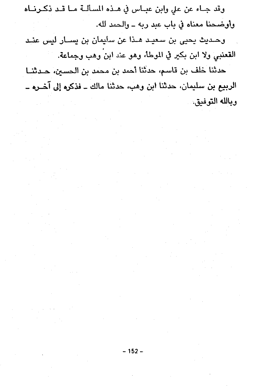 حَدَّثَنَا خَلَفُ بْنُ قَاسِمٍ حَدَّثَنَا أَحْمَدُ بْنُ مُحَمَّدِ بْنِ الْحُسَيْنِ حَدَّثَنَا الرَّبِيعُ بْنُ سُلَيْمَانَ حَدَّثَنَا ابْنُ وَهْبٍ حَدَّثَنَا مَالِكٌ فَذَكَرَهُ إِلَى آخِرِهِ وَبِاللَّهِ التَّوْفِيقُ