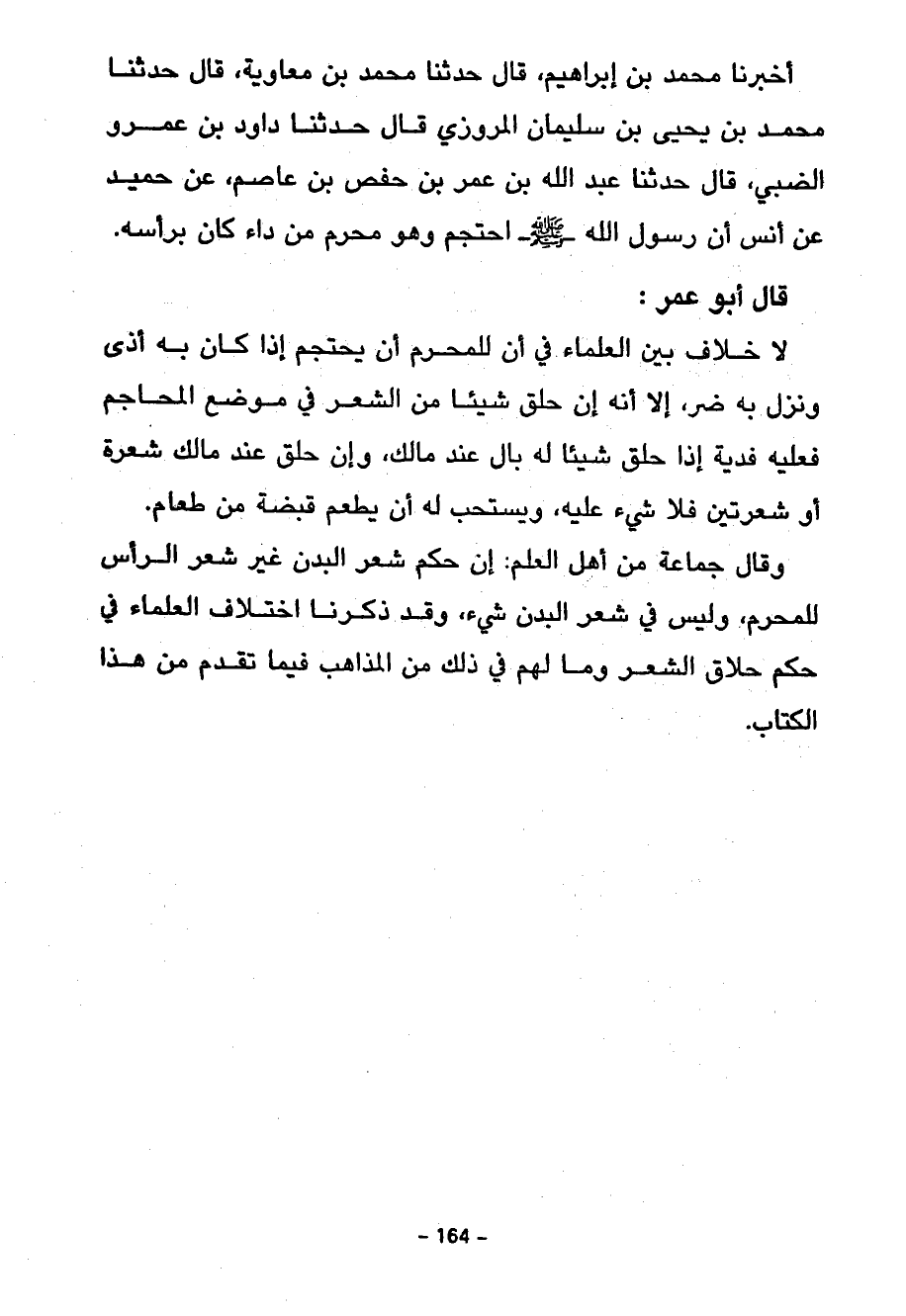 وَقَالَ جَمَاعَةٌ مِنْ أَهْلِ الْعِلْمِ إِنَّ حُكْمَ شَعْرِ الْبَدَنِ غَيْرُ شَعْرِ الرَّأْسِ لِلْمُحْرِمِ وَلَيْسَ فِي شَعْرِ الْبَدَنِ شَيْءٌ وَقَدْ ذَكَرْنَا اخْتِلَافَ الْعُلَمَاءِ فِي حُكْمِ حِلَاقِ الشِّعْرِ وَمَا لَهُمْ فِي ذَلِكَ مِنَ الْمَذَاهِبِ فِيمَا تَقَدَّمَ مِنْ هَذَا الْكِتَابِ