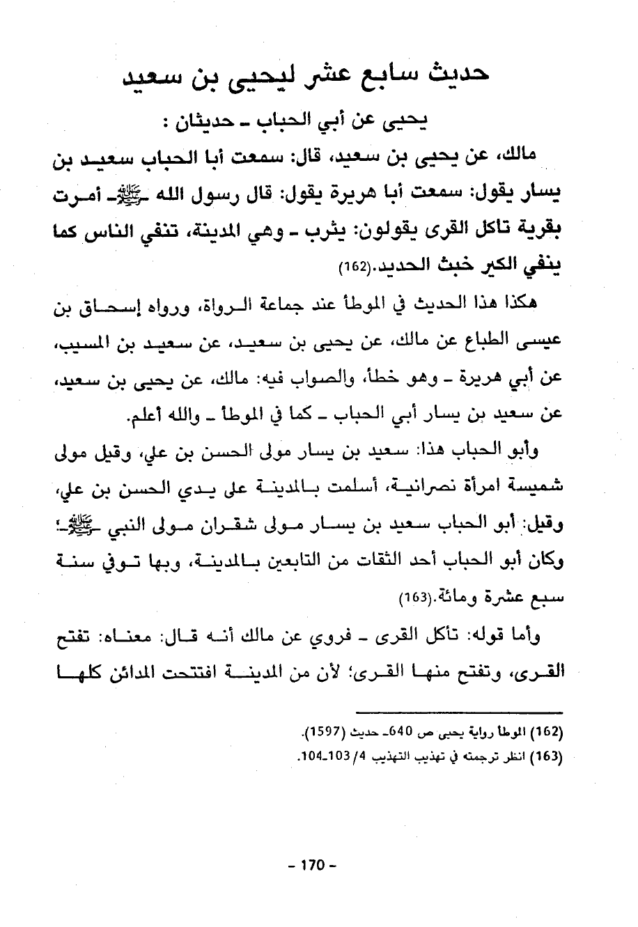 27027027 027 - مَالِكٌ عَنْ يَحْيَى بْنِ سَعِيدٍ قَالَ سَمِعْتُ أَبَا الْحُبَابِ سَعِيدَ بْنَ يَسَارٍ يَقُولُ سَمِعْتُ أَبَا هُرَيْرَةَ يَقُولُ قَالَ رَسُولُ اللَّهِ صَلَّى اللَّهُ عَلَيْهِ وَسَلَّمَ أُمِرْتُ بِقَرْيَةٍ تَأْكُلُ الْقُرَى يَقُولُونَ يَثْرِبُ وَهِيَ الْمَدِينَةُ تَنْفِي النَّاسَ كَمَا يَنْفِي الْكِيرُ خَبَثَ الْحَدِيدِ