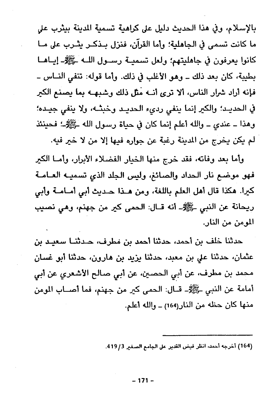 بِالْإِسْلَامِ وَفِي هَذَا الْحَدِيثِ دَلِيلٌ عَلَى كَرَاهِيَةِ تَسْمِيَةِ الْمَدِينَةِ بِيَثْرِبَ عَلَى مَا كَانَتْ تُسَمَّى فِي الْجَاهِلِيَّةِ وَأَمَّا الْقُرْآنُ فَنَزَلَ بِذِكْرِ يَثْرِبَ عَلَى مَا كَانُوا يُعْرَفُونَ فِي جَاهِلِيَّتِهِمْ وَلَعَلَّ تَسْمِيَةَ رَسُولِ اللَّهِ صَلَّى اللَّهُ عَلَيْهِ وَسَلَّمَ إِيَّاهَا بِطَيْبَةَ كَانَ بَعْدَ ذَلِكَ وَهُوَ الْأَغْلَبُ فِي ذَلِكَ
