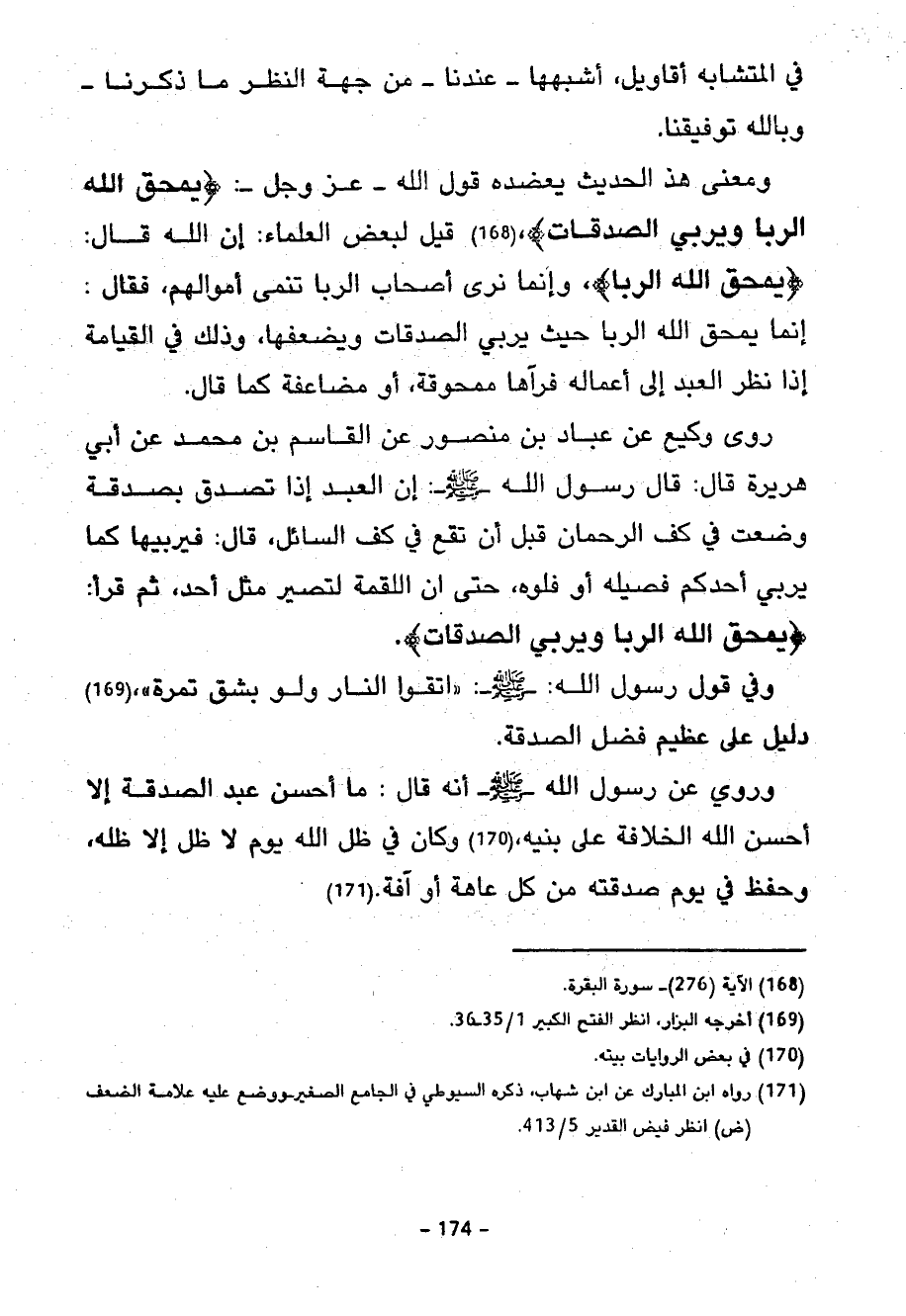 فِي الْمُتَشَابِهِ أَقَاوِيلُ أَشْبَهُهَا عِنْدَنَا مِنْ جِهَةِ النَّظَرِ مَا ذَكَرْنَا وَبِاللَّهِ تَوْفِيقُنَا وَمَعْنَى هَذَا الْحَدِيثِ يُعَضِّدُهُ قَوْلُ اللَّهِ عَزَّ وَجَلَّ يَمْحَقُ اللَّهُ الرِّبَا وَيُرْبِي الصَّدَقَاتِ قِيلَ لِبَعْضِ الْعُلَمَاءِ إِنَّ اللَّهَ قَالَ يَمْحَقُ اللَّهُ الرِّبَا وَإِنَّمَا نَرَى أَصْحَابَ الرِّبَا تُنَمَّى أَمْوَالُهُمْ فَقَالَ إِنَّمَا يَمْحَقُ اللَّهُ الرِّبَا حَيْثُ يُرْبِي الصَّدَقَاتِ وَيُضَعِّفُهَا وَذَلِكَ فِي الْقِيَامَةِ إِذَا نَظَرَ الْعَبْدُ إِلَى أَعْمَالِهِ فَرَآهَا مَمْحُوقَةً أَوْ مُضَاعَفَةً كَمَا قَالَ