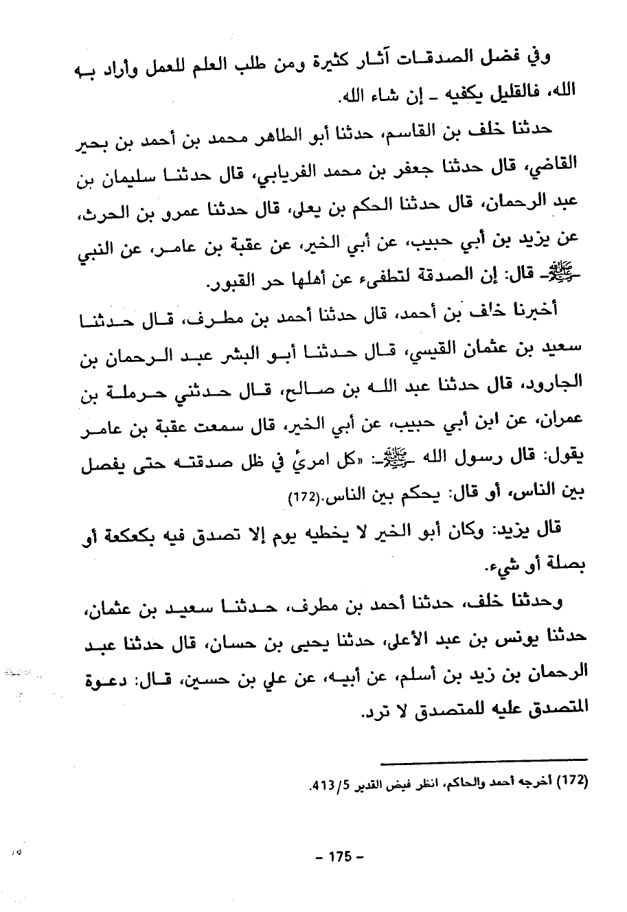 وَفِي فَضْلِ الصَّدَقَاتِ آثَارٌ كَثِيرَةٌ وَمَنْ طَلَبَ الْعِلْمَ لِلْعَمَلِ وَأَرَادَ بِهِ اللَّهَ فَالْقَلِيلُ يَكْفِيهِ إِنْ شَاءَ اللَّهُ