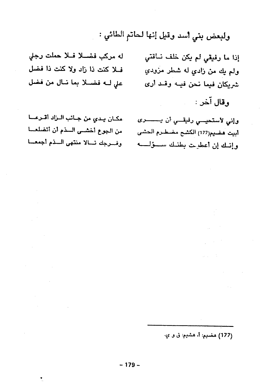 وَلِبَعْضِ بَنِي أَسَدٍ وَقِيلَ إِنَّهَا لِحَاتِمٍ الطَّائِيِّ إِذَا مَا رَفِيقِي لَمْ يَكُنْ خَلْفَ نَاقَتِي لَهُ مُرَكَبٌ فَضْلًا فَلَا حَمَلْتُ رِجْلِي وَلَمْ يَكْ مِنْ زَادِي لَهُ شَطْرُ مِزْوَدِي فَلَا كُنْتُ ذَا زَادٍ وَلَا كُنْتُ ذَا فَضْلِ شَرِيكَانِ فِيمَا نَحْنُ فِيهِ وَقَدْ أَرَى عَلَيَّ لَهُ فَضْلًا بِمَا نَالَ مِنْ فَضْلِ وَقَالَ آخَرُ وَإِنِّي لَأَسْتَحْيِي رَفِيقِي أَنْ يَرَى مَكَانَ يَدِي مِنْ جَانِبِ الزَّادِ أَقْرَعًا أَبِيتُ هَضِيمَ الْكَشْحِ مُضْطَرِمَ الْحَشَى مِنَ الْجُوعِ أَخْشَى الذَّمَّ أَنْ أَتَضَلَّعَا وَإِنَّكَ إِنْ أَعْطَيْتَ بَطْنَكَ سُؤْلَهُ وَفَرْجَكَ نَالَا مُنْتَهَى الذَّمِّ أَجْمَعَا