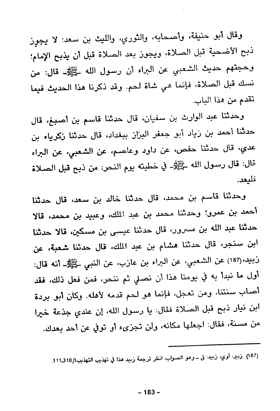 وَحَدَّثَنَا قَاسِمُ بْنُ مُحَمَّدٍ قَالَ حَدَّثَنَا خَالِدُ بْنُ سَعْدٍ قَالَ حَدَّثَنَا أَحْمَدُ بْنُ عَمْرِو وَحَدَّثَنَا مُحَمَّدُ بْنُ عَبْدِ الْمَلِكِ وَعُبَيْدُ بْنُ مُحَمَّدٍ قَالَا حَدَّثَنَا عَبْدُ اللَّهِ بْنُ مَسْرُورٍ قَالَ حَدَّثَنَا عِيسَى بْنُ مِسْكِينٍ قَالَا حَدَّثَنَا ابْنُ سَنْجَرٍ قَالَ حَدَّثَنَا هِشَامُ بْنُ عَبْدِ الْمَلِكِ قَالَ حَدَّثَنَا شُعْبَةُ عَنْ زُبَيْدٍ عَنِ الشَّعْبِيِّ عَنِ الْبَرَاءِ بْنِ عَازِبٍ عن النبي أَنَّهُ قَالَ أَوَّلُ مَا نَبْدَأُ بِهِ فِي يَوْمِنَا هَذَا أَنْ نُصَلِّيَ ثُمَّ نَنْحَرَ فَمَنْ فَعَلَ ذَلِكَ فَقَدْ أَصَابَ سُنَّتَنَا وَمَنْ تَعَجَّلَ فَإِنَّمَا هُوَ لَحْمٌ قَدَّمَهُ لِأَهْلِهِ