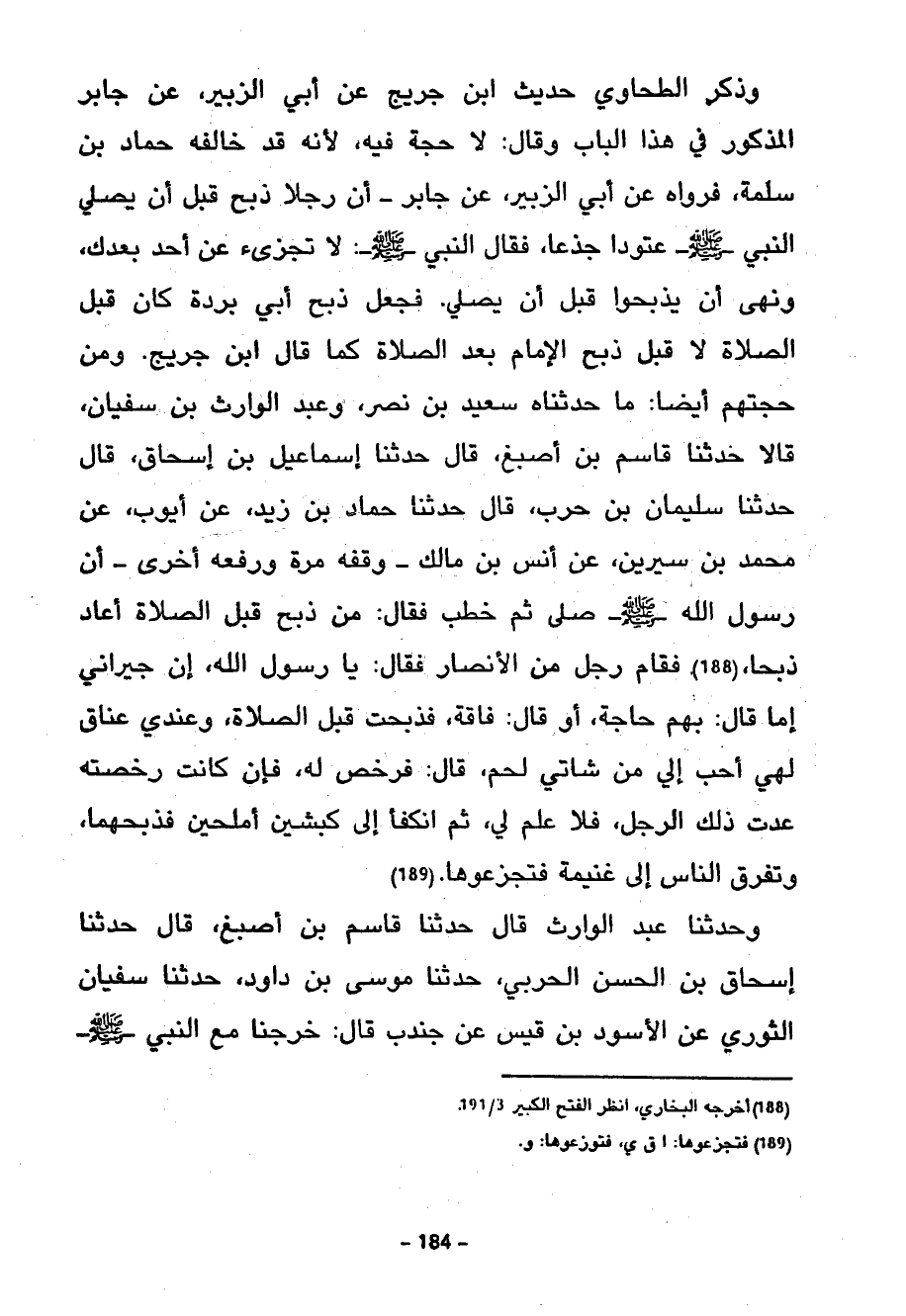 وَذَكَرَ الطَّحَاوِيُّ حَدِيثَ ابْنِ جُرَيْجٍ عَنْ أَبِي الزُّبَيْرِ عَنْ جَابِرٍ الْمَذْكُورَ فِي هَذَا الْبَابِ وَقَالَ لَا حُجَّةَ فِيهِ لِأَنَّهُ قَدْ خَالَفَهُ حَمَّادُ بْنُ سَلَمَةَ فَرَوَاهُ عَنْ أَبِي الزُّبَيْرِ عَنْ جَابِرٍ أَنَّ رَجُلًا ذَبَحَ قَبْلَ أَنْ يصلي النبي عتودا جذعا فقال النبي لا تجزىء عَنْ أَحَدٍ بَعْدَكَ وَنَهَى أَنْ يَذْبَحُوا قَبْلَ أَنْ يُصَلِّيَ