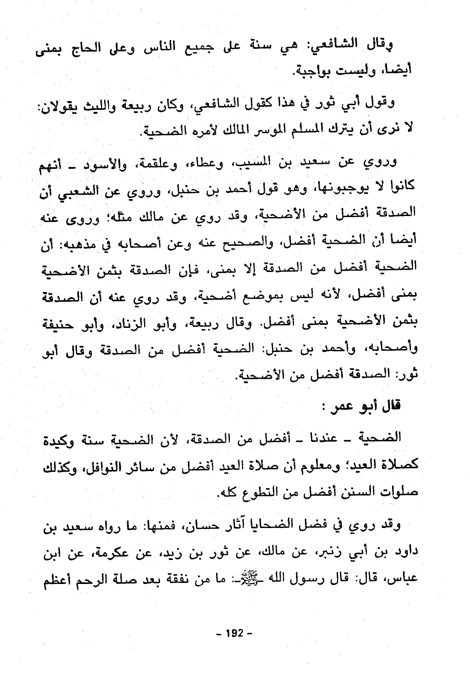 قَالَ أَبُو عُمَرَ الضَّحِيَّةُ عِنْدَنَا أَفْضَلُ مِنَ الصَّدَقَةِ لِأَنَّ الضَّحِيَّةَ سُنَّةٌ وَكِيدَةٌ كَصَلَاةِ الْعِيدِ وَمَعْلُومٌ أَنَّ صَلَاةَ الْعِيدِ أَفْضَلُ مِنْ سَائِرِ النَّوَافِلِ وَكَذَلِكَ صَلَوَاتُ السُّنَنِ أَفْضَلُ مِنَ التَّطَوُّعِ كُلِّهِ