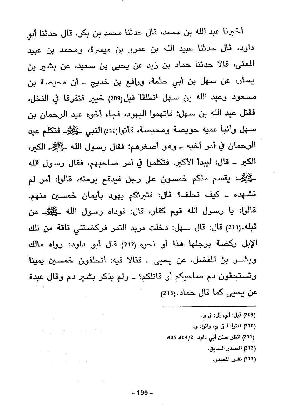 فَتَكَلَّمُوا فِي أمر صاحبهم فقال رسول الله يُقْسِمُ مِنْكُمْ خَمْسُونَ عَلَى رَجُلٍ فَيُدْفَعُ بِرُمَّتِهِ قَالُوا أَمْرٌ لَمْ نَشْهَدْهُ كَيْفَ نَحْلِفُ قَالَ فَتُبَرِّئُكُمْ يَهُودُ بِأَيْمَانِ خَمْسِينَ مِنْهُمْ