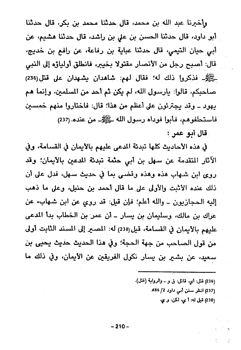 قَالَ أَبُو عُمَرَ فِي هَذِهِ الْأَحَادِيثِ كُلِّهَا تَبْدِئَةُ الْمُدَّعَى عَلَيْهِمْ بِالْأَيْمَانِ فِي الْقَسَامَةِ وَفِي الْآثَارِ الْمُتَقَدِّمَةِ عَنْ سَهْلِ بْنِ أَبِي حَثْمَةَ تَبْدِئَةُ الْمُدَّعِينَ بِالْأَيْمَانِ وَقَدْ رَوَى ابْنُ شِهَابٍ هَذِهِ وَهَذِهِ وَقَضَى بِمَا فِي حَدِيثِ سَهْلٍ فَدَلَّ عَلَى أَنَّ ذَلِكَ عِنْدَهُ الْأَثْبَتُ وَالْأَوْلَى عَلَى مَا قَالَ أَحْمَدُ بْنُ حَنْبَلٍ وَعَلَى مَا ذَهَبَ إِلَيْهِ الْحِجَازِيُّونَ وَاللَّهُ أَعْلَمُ فَإِنْ قِيلَ قَدْ رُوِيَ عَنِ ابْنِ شِهَابٍ عَنْ عِرَاكِ بْنِ مَالِكٍ وَسُلَيْمَانَ بْنِ يَسَارٍ أَنَّ عُمَرَ بْنَ الْخَطَّابِ بَدَأَ الْمُدَّعَى عَلَيْهِمْ بِالْأَيْمَانِ فِي الْقَسَامَةِ قِيلَ لَهُ الْمَصِيرُ إِلَى الْمُسْنَدِ الثَّابِتِ أَوْلَى مِنْ قَوْلِ الصَّاحِبِ مِنْ جِهَةِ الْحُجَّةِ وَفِي هَذَا الْحَدِيثِ حَدِيثِ يَحْيَى بْنِ سَعِيدٍ عَنْ بُشَيْرِ بْنِ يَسَارٍ نُكُولُ الْفَرِيقَيْنِ عَنِ الْأَيْمَانِ وَفِي ذَلِكَ مَا