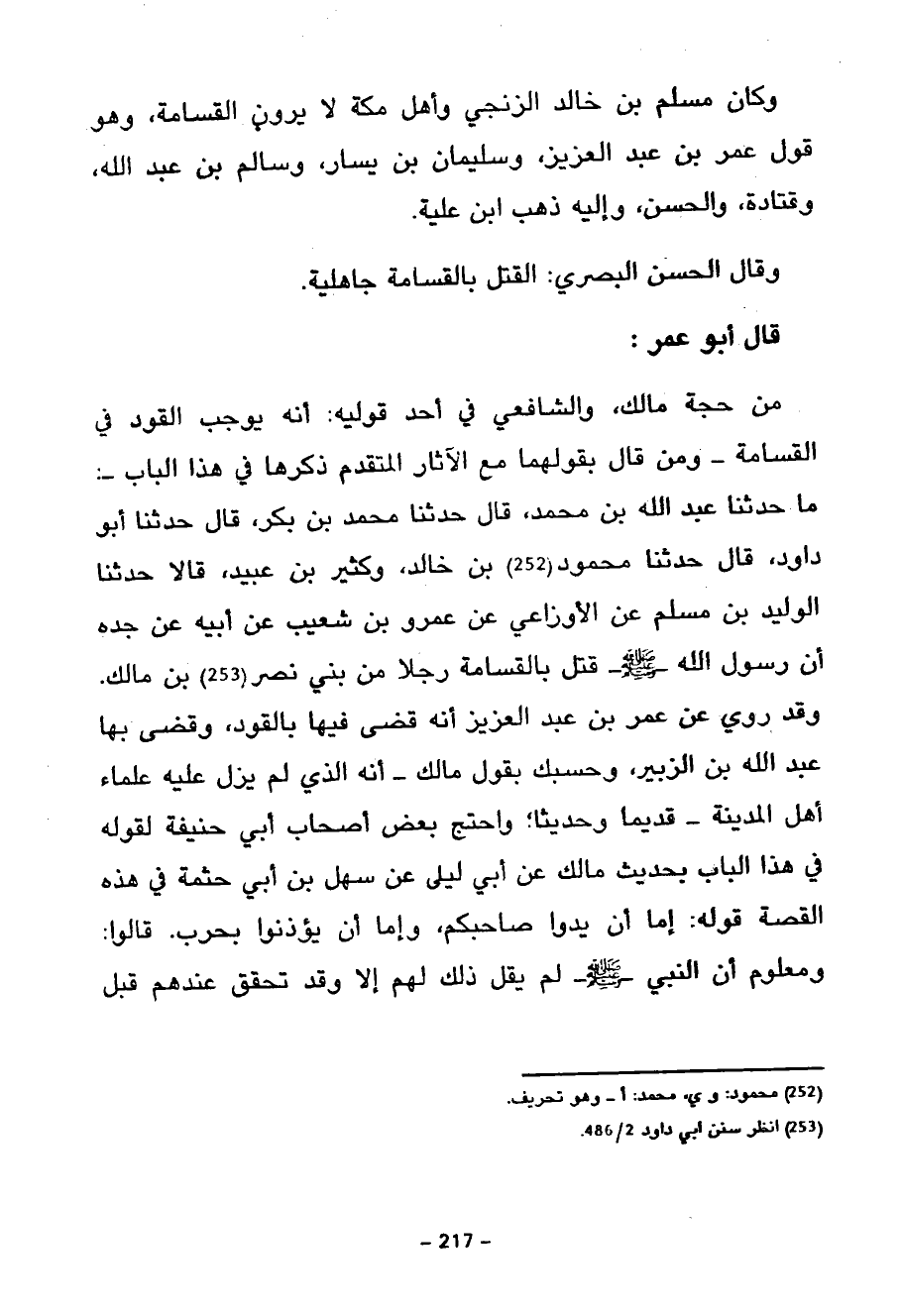 قَالَ أَبُو عُمَرَ مِنْ حُجَّةِ مَالِكٍ وَالشَّافِعِيِّ فِي أَحَدِ قَوْلَيْهِ أَنَّهُ يُوجِبُ الْقَوْدَ فِي الْقَسَامَةِ وَمَنْ قَالَ بِقَوْلِهِمَا مَعَ الْآثَارِ الْمُتَقَدِّمِ ذِكْرُهَا فِي هَذَا الْبَابِ مَا حَدَّثَنَا عَبْدُ اللَّهِ بْنُ مُحَمَّدٍ قَالَ حَدَّثَنَا مُحَمَّدُ بْنُ بَكْرٍ قَالَ حَدَّثَنَا أَبُو دَاوُدَ قَالَ حَدَّثَنَا مَحْمُودُ بْنُ خَالِدٍ وَكَثِيرُ بْنُ عُبَيْدٍ قَالَا حَدَّثَنَا الْوَلِيدُ بْنُ مُسْلِمٍ عَنِ الْأَوْزَاعِيِّ عَنْ عَمْرِو بْنِ شُعَيْبٍ عَنْ أَبِيهِ عَنْ جده أن رسول الله قَتَلَ بِالْقَسَامَةِ رَجُلًا مِنْ بَنِي نَصْرِ بْنِ مَالِكٍ