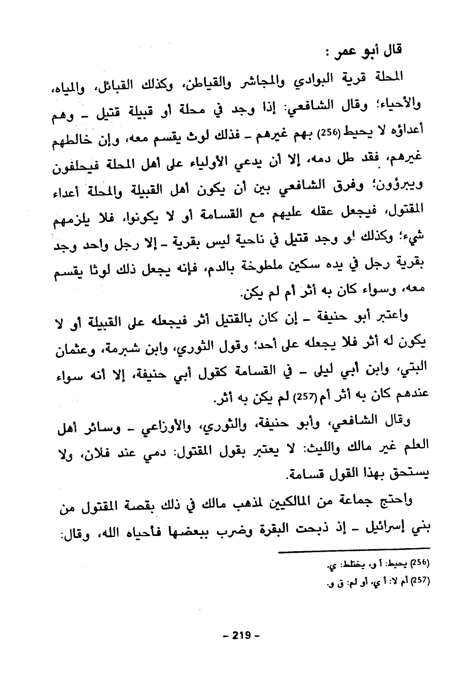 وَاعْتَبَرَ أَبُو حَنِيفَةَ إِنْ كَانَ بِالْقَتِيلِ أَثَرٌ فَيَجْعَلُهُ عَلَى الْقَبِيلَةِ أَوْ لَا يَكُونُ أَثَرٌ لَهُ فَلَا يَجْعَلُهُ عَلَى أَحَدٍ وَقَوْلُ الثَّوْرِيِّ وَابْنِ شُبْرُمَةَ وَعُثْمَانَ الْبَتِّيِّ وَابْنِ أَبِي لَيْلَى فِي الْقَسَامَةِ كَقَوْلِ أَبِي حَنِيفَةَ إِلَّا أَنَّهُ سَوَاءٌ عِنْدَهُمْ كَانَ بِهِ أَثَرٌ أَمْ لَمْ يَكُنْ بِهِ أَثَرٌ
