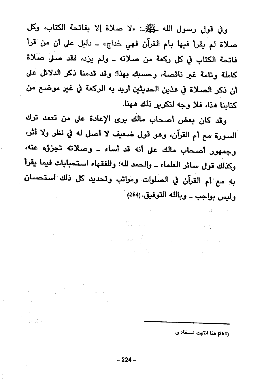 وَفِي قَوْلِ رَسُولِ اللَّهِ صَلَّى اللَّهُ عَلَيْهِ وَسَلَّمَ لَا صَلَاةَ إِلَّا بِفَاتِحَةِ الْكِتَابِ وَكُلُّ صَلَاةٍ لَمْ يُقْرَأْ فِيهَا بِأُمِّ الْقُرْآنِ فَهِيَ خِدَاجٌ دَلِيلٌ عَلَى أَنَّ مَنْ قَرَأَ فَاتِحَةَ الْكِتَابِ فِي كُلِّ رَكْعَةٍ مِنْ صَلَاتِهِ وَلَمْ يَزِدْ فَقَدْ صَلَّى صَلَاةً كَامِلَةً وَتَامَّةً غَيْرَ نَاقِصَةٍ وَحَسْبُكَ بِهَذَا وَقَدْ قَدَّمْنَا ذِكْرَ الدَّلَائِلِ عَلَى أَنَّ ذِكْرَ الصَّلَاةِ فِي هَذَيْنِ الْحَدِيثَيْنِ أُرِيدَ بِهِ الرَّكْعَةُ فِي غَيْرِ مَوْضِعٍ مِنْ كِتَابِنَا هَذَا فَلَا وجه لتكرير ذلك ههنا