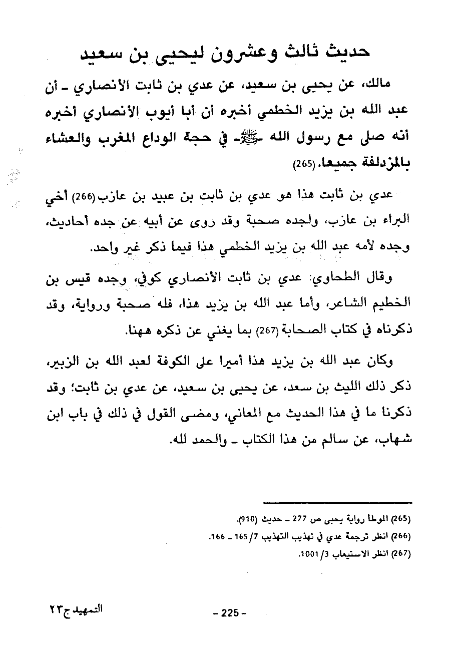 627 - مَالِكٌ عَنْ يَحْيَى بْنِ سَعِيدٍ عَنْ عَدِيِّ بْنِ ثَابِتٍ الْأَنْصَارِيِّ أَنَّ عَبْدَ اللَّهِ بْنَ يَزِيدَ الْخَطْمِيَّ أَخْبَرَهُ أَنَّ أَبَا أَيُّوبَ الْأَنْصَارِيَّ أَخْبَرَهُ أَنَّهُ صَلَّى مَعَ رَسُولِ اللَّهِ صَلَّى اللَّهُ عَلَيْهِ وَسَلَّمَ فِي حَجَّةِ الْوَدَاعِ الْمَغْرِبَ وَالْعِشَاءَ بِالْمُزْدَلِفَةِ جَمِيعًا